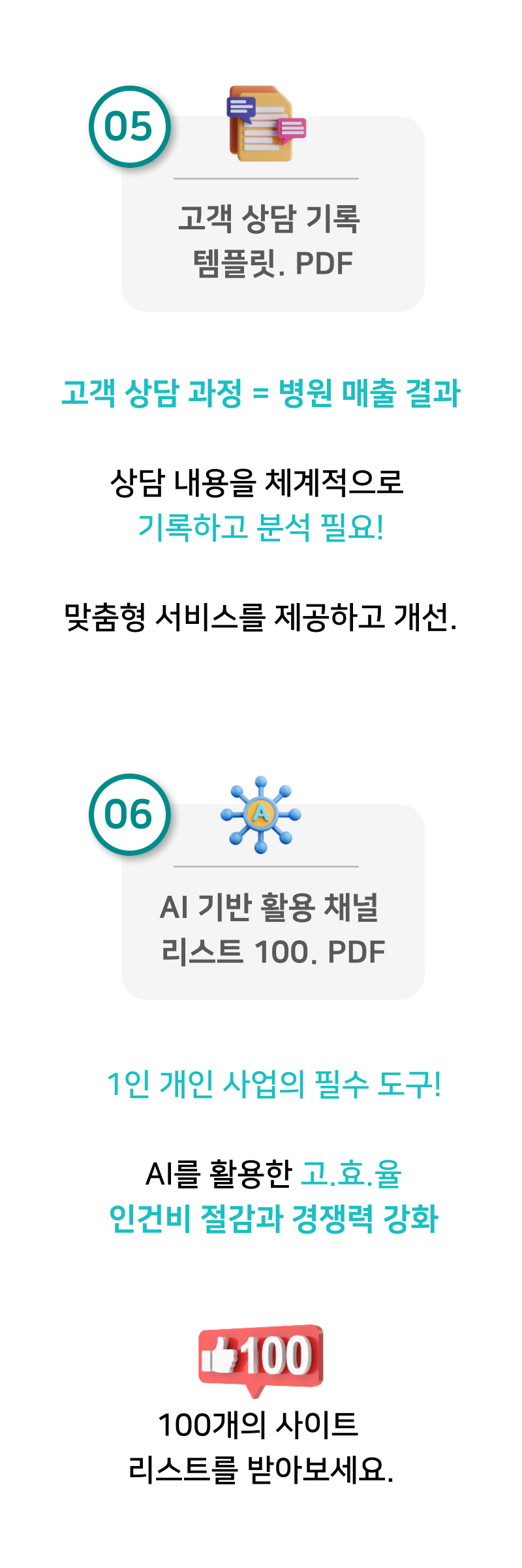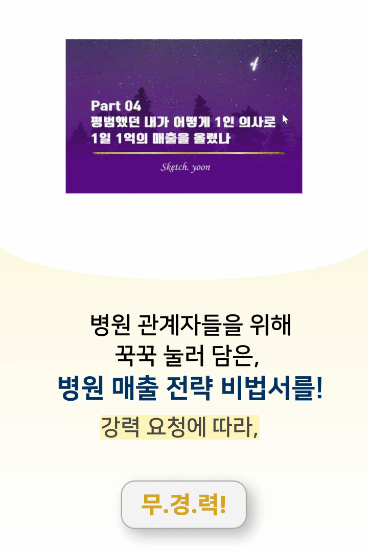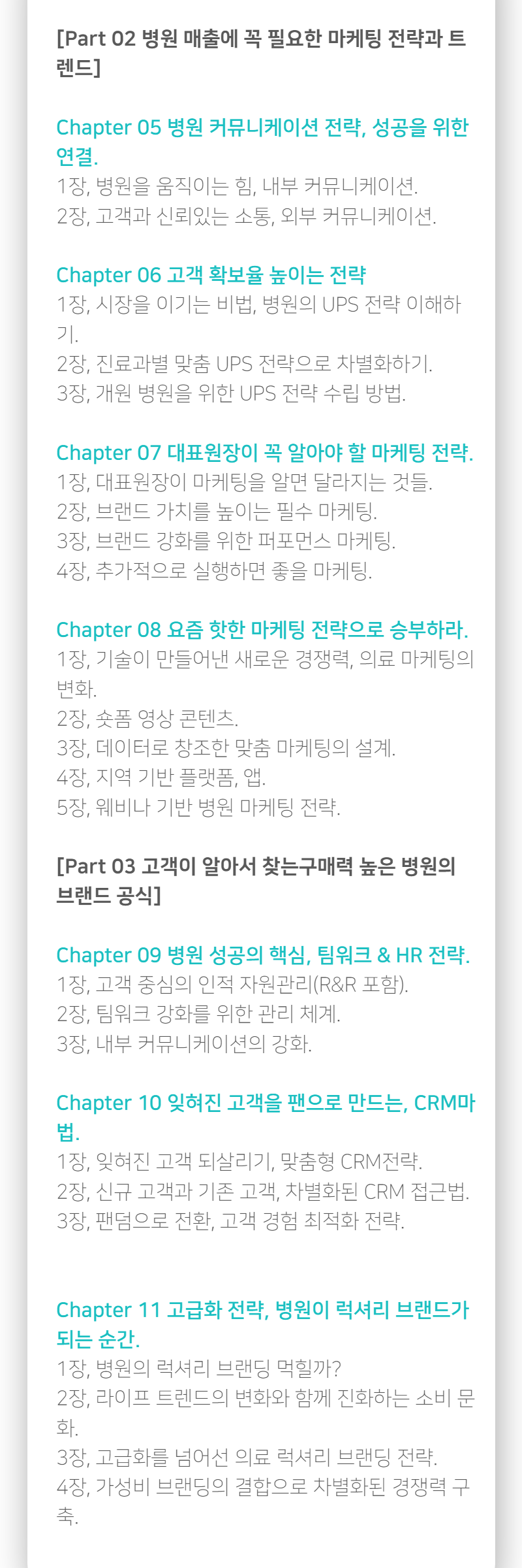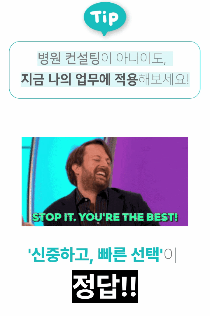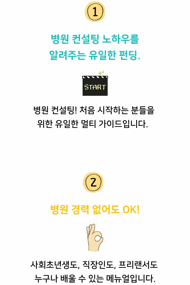 1, 2차 급의 병의원과 단과 종합병원의 경우는 오히려 밀착해서 관리해주는 형태의 컨설팅이나 마케팅이 더 효율적이며, 소통에도 유리하기에 1인 기업으로 컨설팅을 시작해도 충분히 성공할 수 있어요. 그렇기에 관심이 있으신 분들은 도전해 보셨으면 합니다.