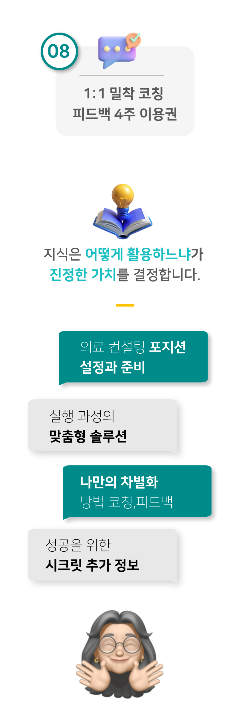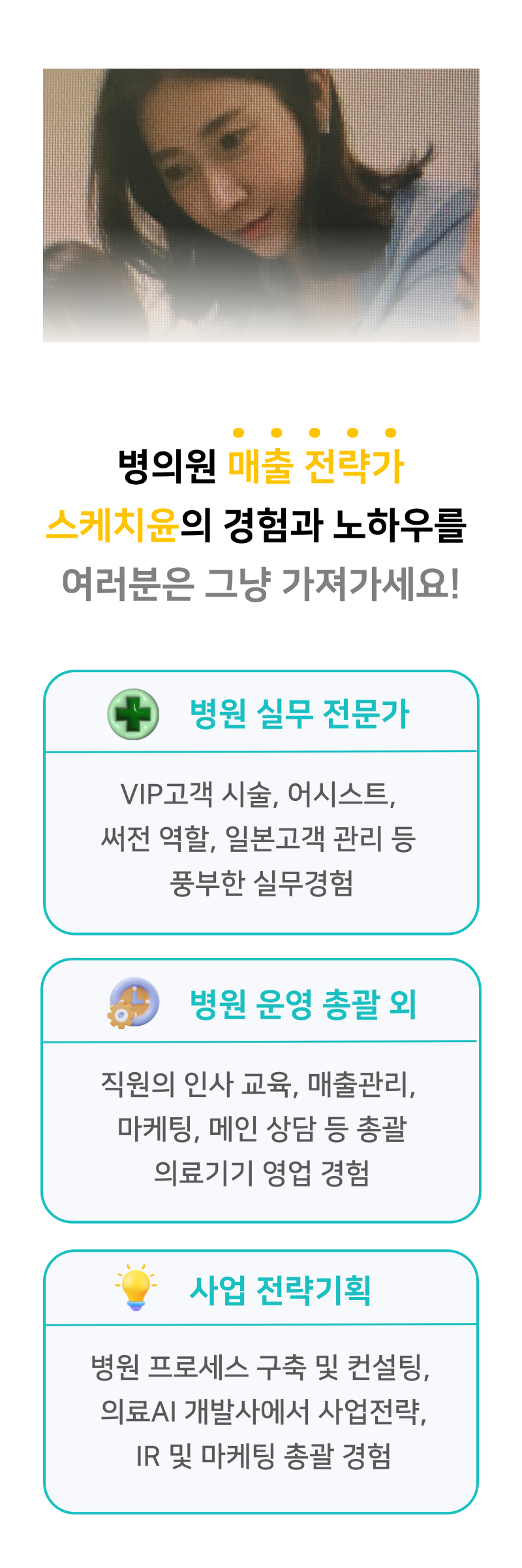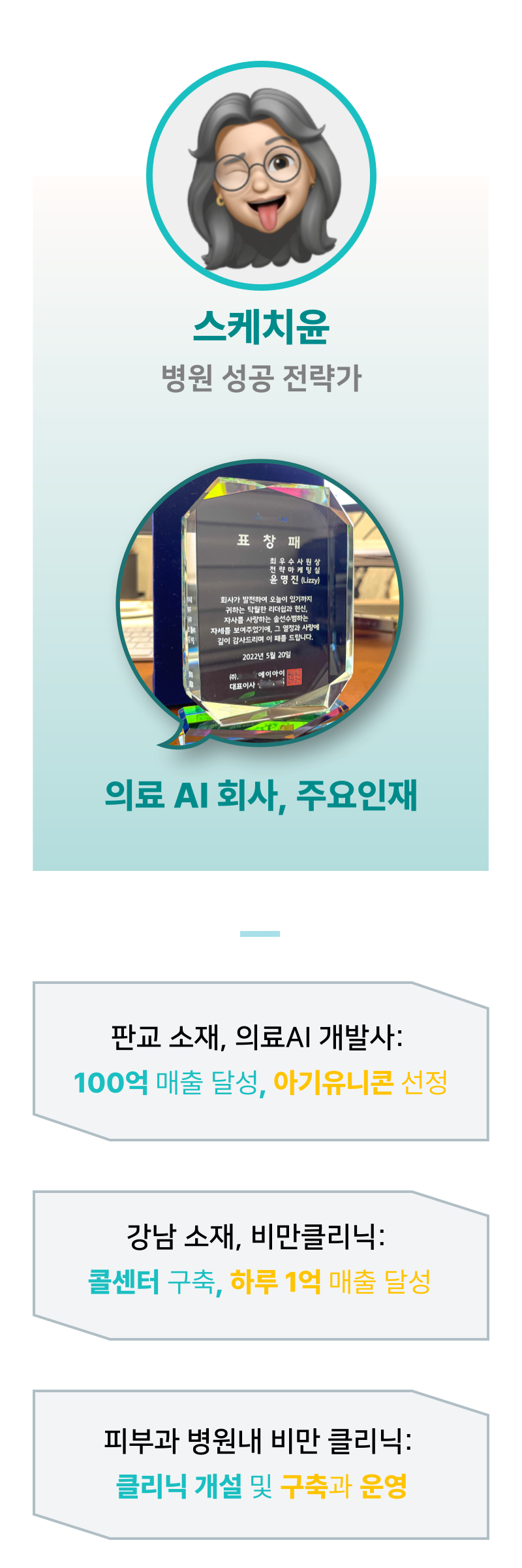 저는 실무부터 총괄 업무까지 경험하며 단 1명의 의사만 있는 병원의 매출을 하루 1억원 이상으로 끌어 올린 경험이 있습니다. 의료 AI 솔루션 개발 회사에서 얻은 기술적 지식들을 통해 빠르게 컨설턴트 전문가의 길로 안내해드리고자 합니다.