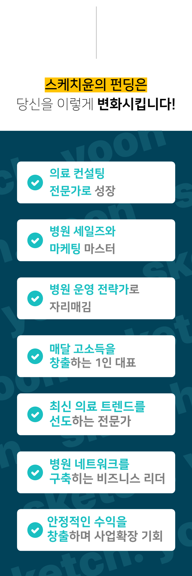 스케치윤의 1인 기업을 확장하여, 보다 많은 사람들에게 질 높은 컨설팅 서비스를 제공하고, 이를 위해 필요한 인프라와 인재를 확보하고, 지속적인 연구와 개발을 통해 비즈니스를 발전시키는 좋은 기회가 되었으면 합니다.