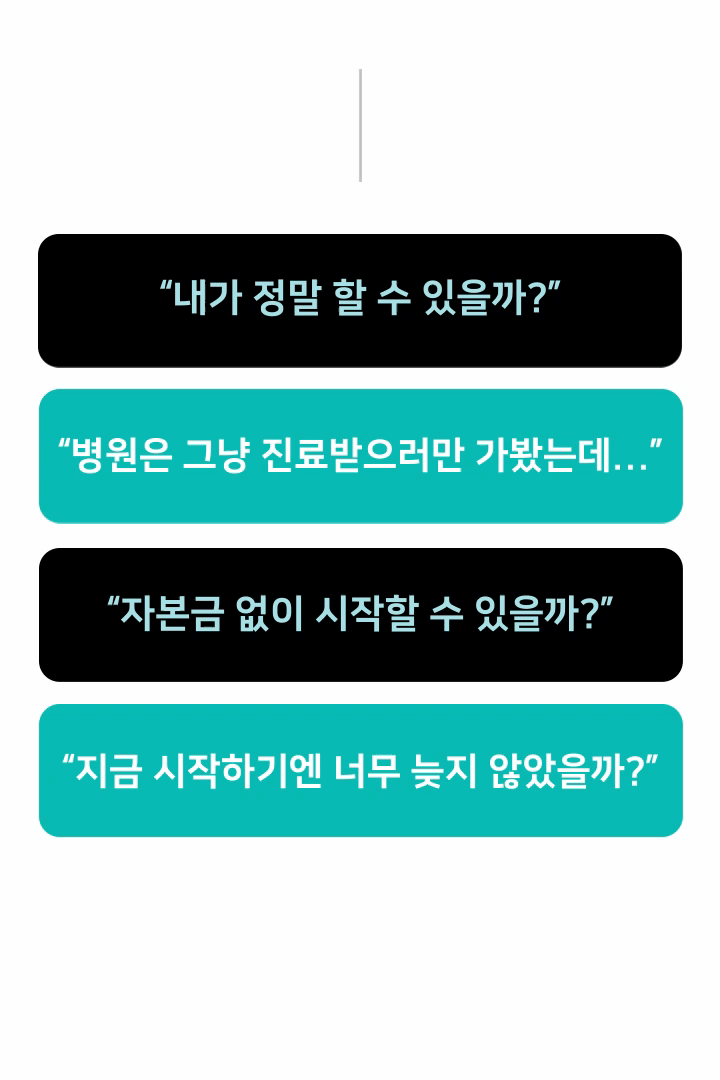 20대부터 지금까지 20여년간 저는 의료분야에 몸담고 일해왔습니다. 저는 한시도 머물러 있지 않고, 도전하고 배우며 타이탄의 도구들을 장착해 왔어요. 20대 초 부모님의 권유로 간호조무사 자격증을 취득한 것이, 의료 분야에서 일하며 여기까지 오게 한 중요한 계기였던 것 같습니다.