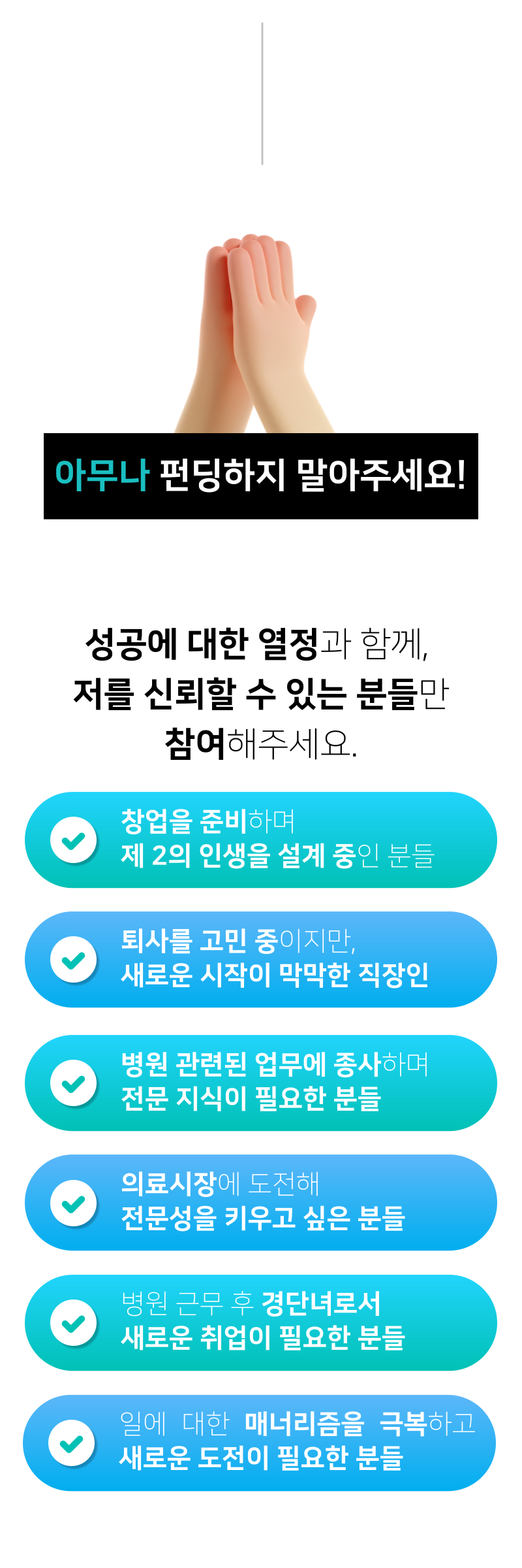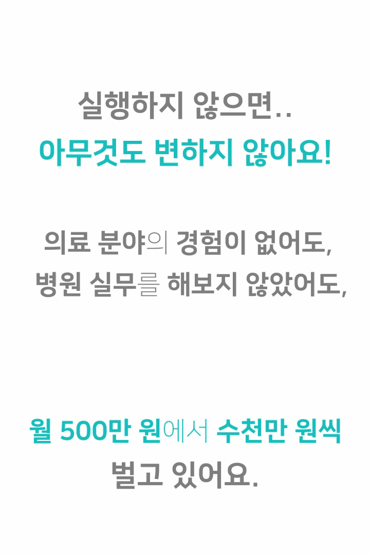 의료시장은 사업규모가 크고 넓어, 소위 돈벌기 위해 뛰어드는 분들을 쉽게 접할 수 있어요. 하지만 실무를 아는 것은 경쟁에서 우위에 설수 있기에, 초보자에서 전문가가 될 수 있도록 저의 실무경험을 기반으로 도와드리고자 합니다.