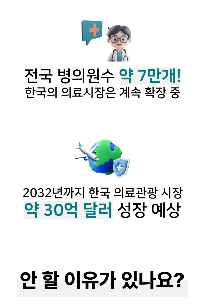 또한, 한국의 의료서비스 시장은 계속 성장하고 있으며, 코로나 이후 의료관광의 열풍도 다시 시작될 것으로 기대하고 있어요.