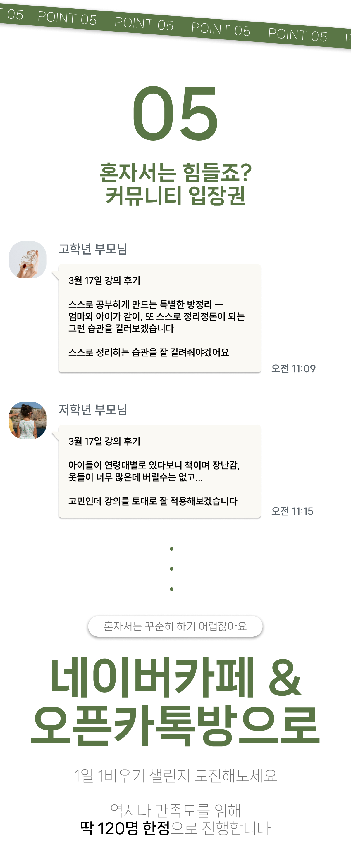 A. 오픈채팅방은 서로 소통하고 공유하는 방입니다. 1일1물건 정리(비우기)는 네이버 카페를 통해 진행될 예정입니다.