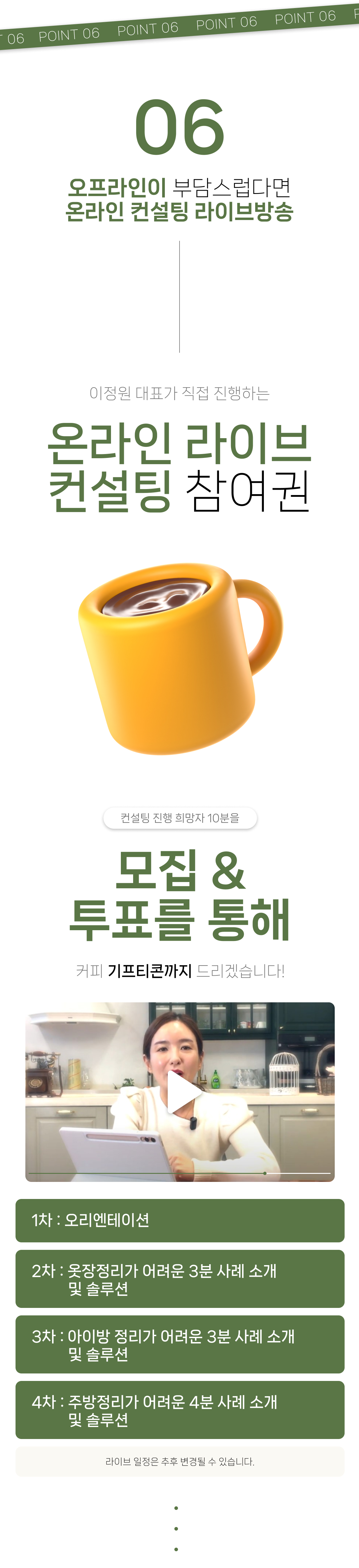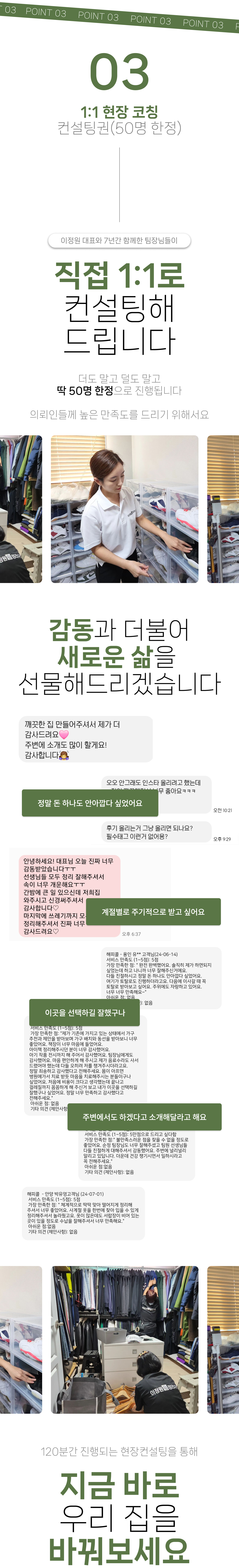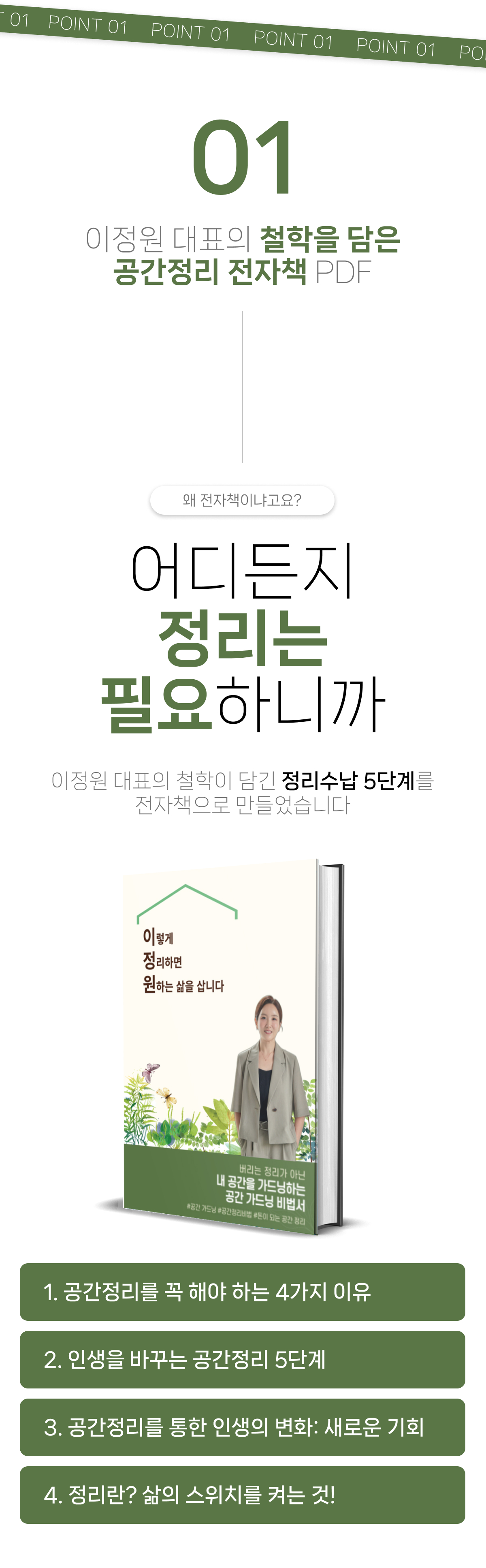 - 정리는 단순히 새로운 수납용품을 구매하거나 물건을 버리는 것이 아닌, 체계적인 정리 시스템을 구축하고 스스로도 편하게 정리할 수 있는 환경으로 만들어주는 것을 목표로 삼고 있습니다. 그래서 정리는 삶의 스위치를 켜는 것이며, 인생을 희망의 빛으로 환하게 만들어가는 매우 중요한 삶의 일부라 생각합니다.