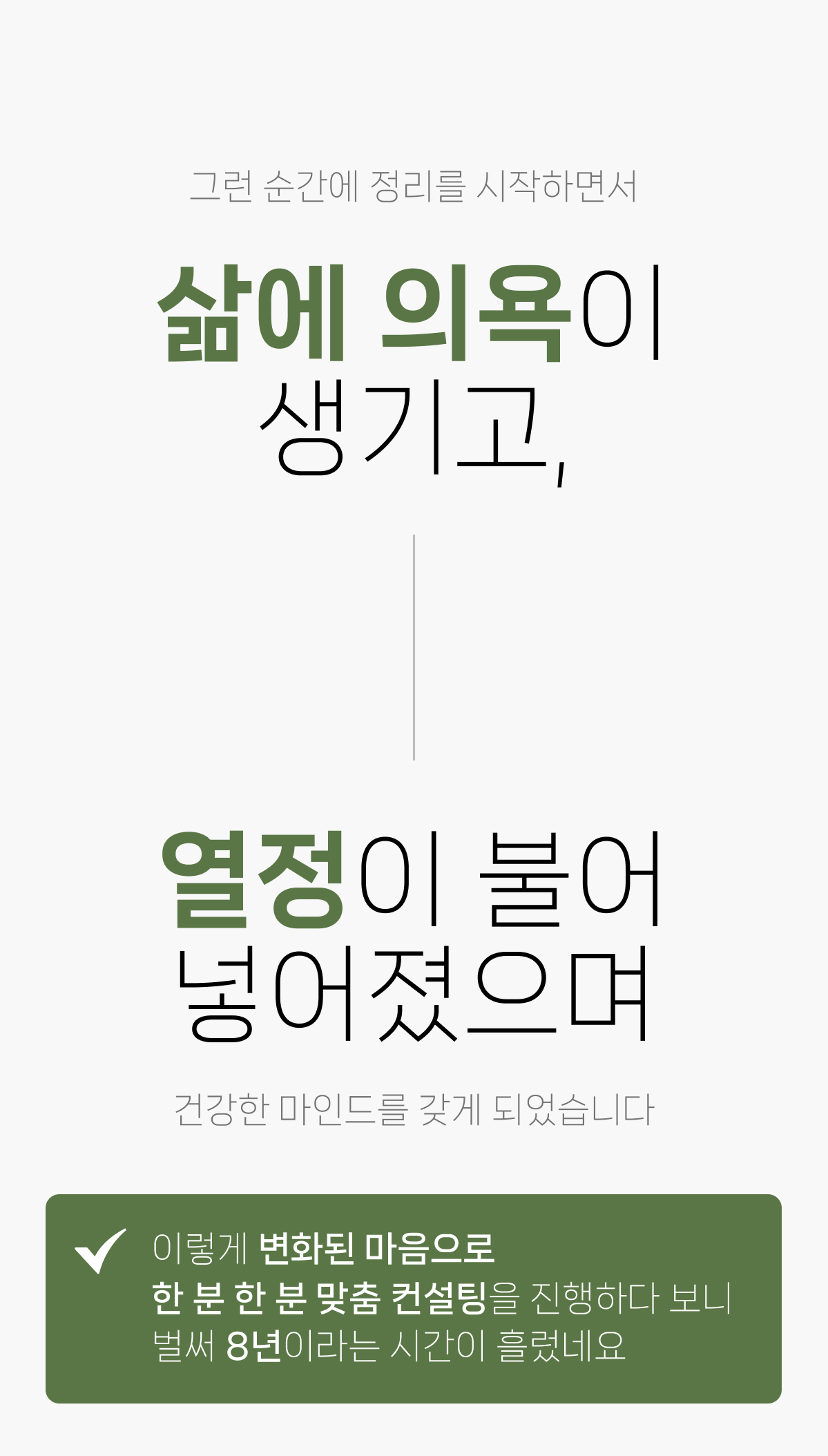 어머니가 루게릭병에 걸려 7년의 시간을 병간호에만 매달렸습니다. 그런 어머니가 돌아가시니 우울증이 왔고, 집안은 엉망이 되어갔습니다. 아이들 케어도 힘이 들고, 남편은 남편대로 힘들어지니 다투고, 몸과 마음이 지치는 시간의 연속이었습니다. 그런 순간에 정리를 시작하면서 삶에 의욕이 생기고, 열정이 불어 넣어졌으며, 건강한 마인드를 갖게 되었습니다. 변화된 마음으로 한 분 한 분 맞춤형 컨설팅을 진행하다 보니 8년이라는 시간이 흘렀습니다.