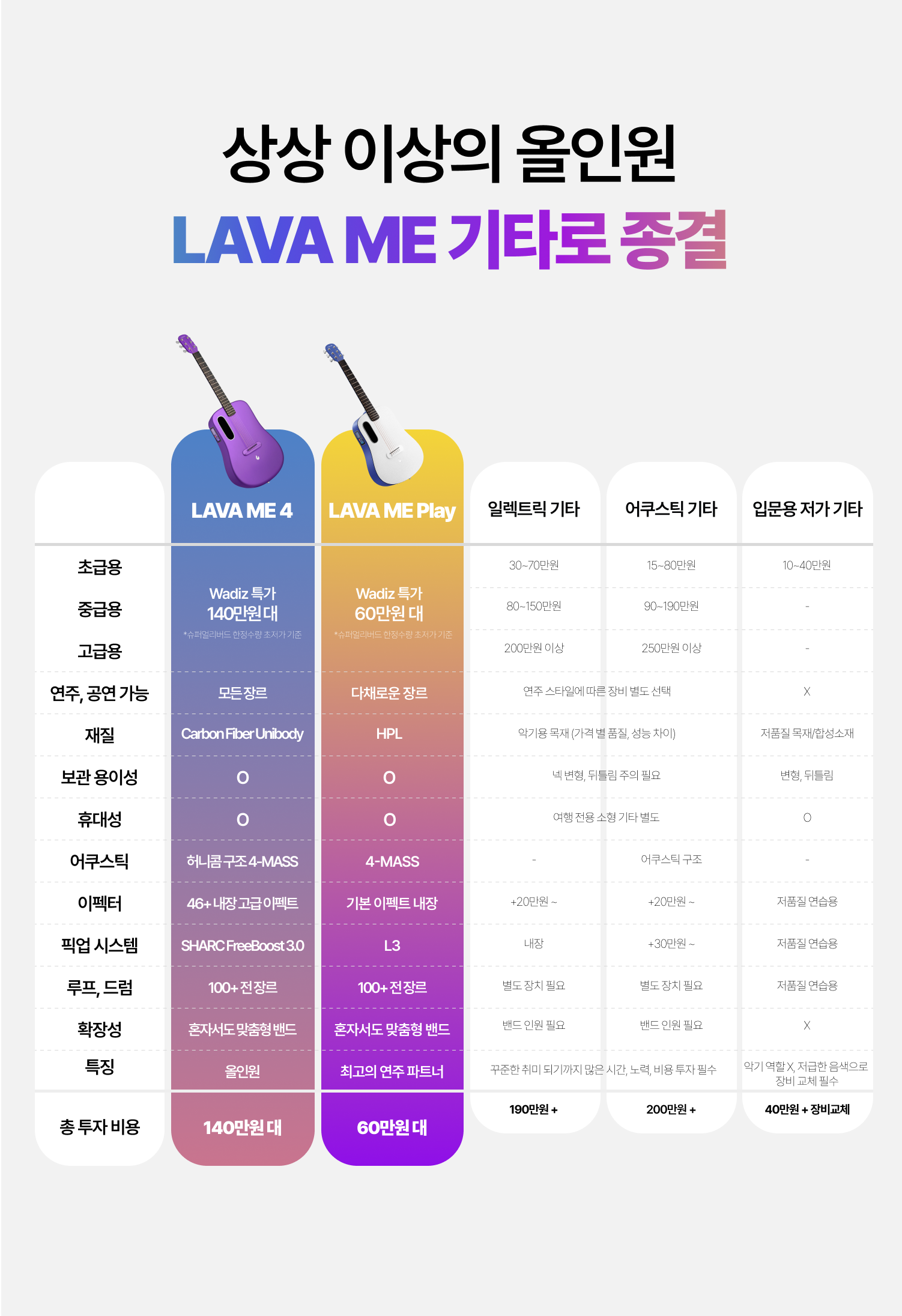 저희가 LAVAMUSIC과의 제휴를 하게 된 것도 이러한 지향점이 저희가 추구하는 방식과 결이 맞아서였습니다. LAVA MUSIC은 세계 최초로 스마트 카본 기타를 개발하고, 아마존에서도 충분한 경쟁력을 보였기 때문에 전략적 파트너로서 신뢰를 가지고 와디즈 서포터 분들께 LAVA 제품들을 소개해드리고 싶어서 이 펀딩을 진행하게 되었습니다. 앞으로도 인생에서 멋진 경험을 할 수 있는 좋은 제품을 좋은 가격에 제공하여 모두에게 더 나은 생활을 선사하고자하는 저희 존버드와 LAVA MUSIC을 응원 부탁드립니다.