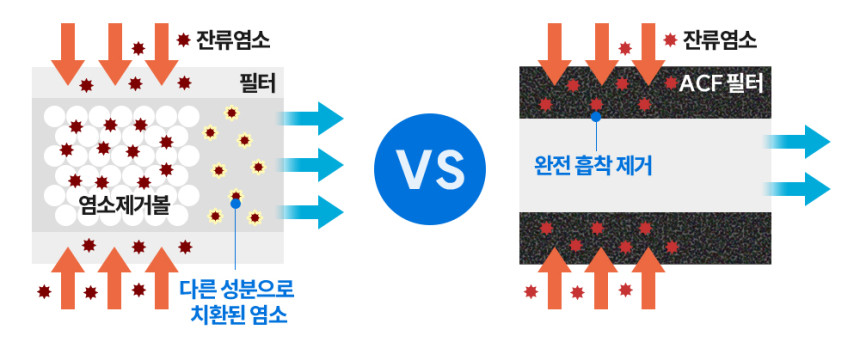 ACF 필터는 잔류 염소를 흡착 방식으로 확실하게 제거합니다!