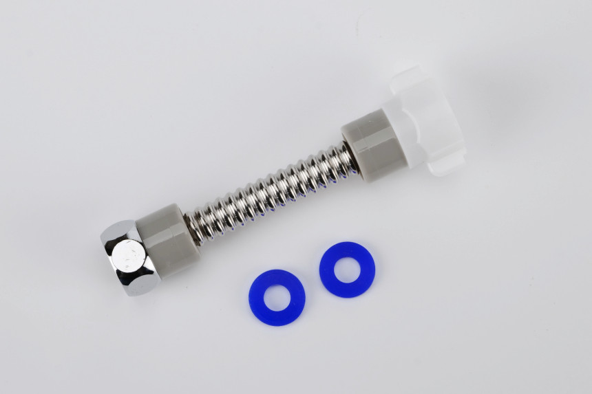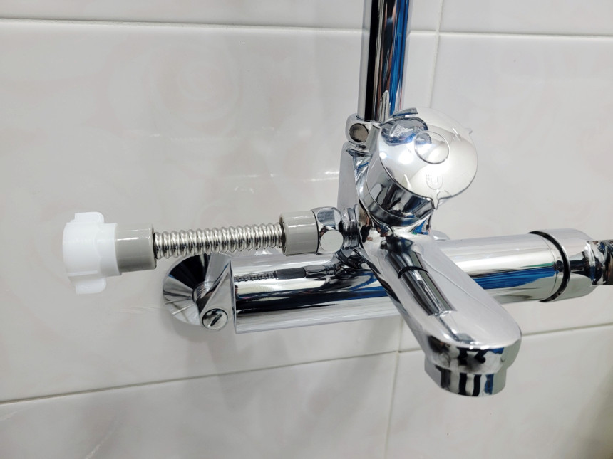 샤워기 줄이 수전의 아래쪽이 아니라 위 사진과 같은 수전은 샤워기 호스를 측면에 설치해야 하는 경우가 있습니다. 이 경우 나노히어로 바디에 포함된 연결 부품으로는 설치를 할 수 없습니다.