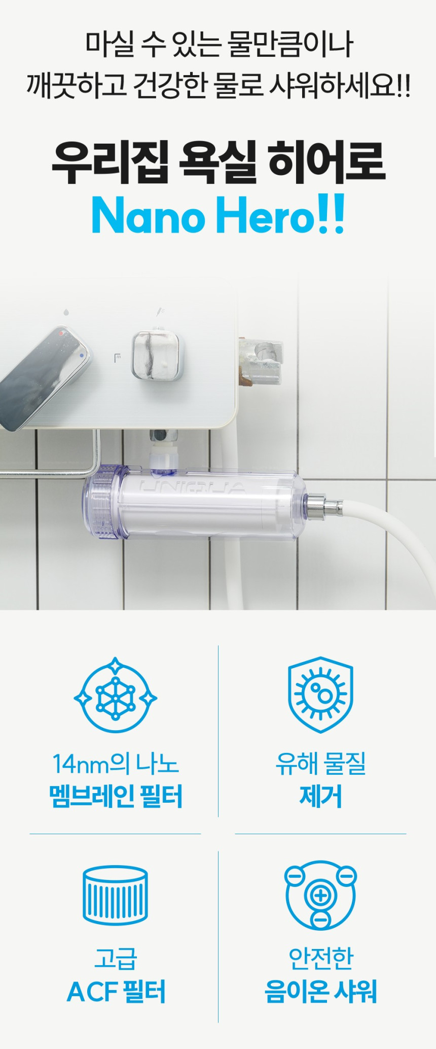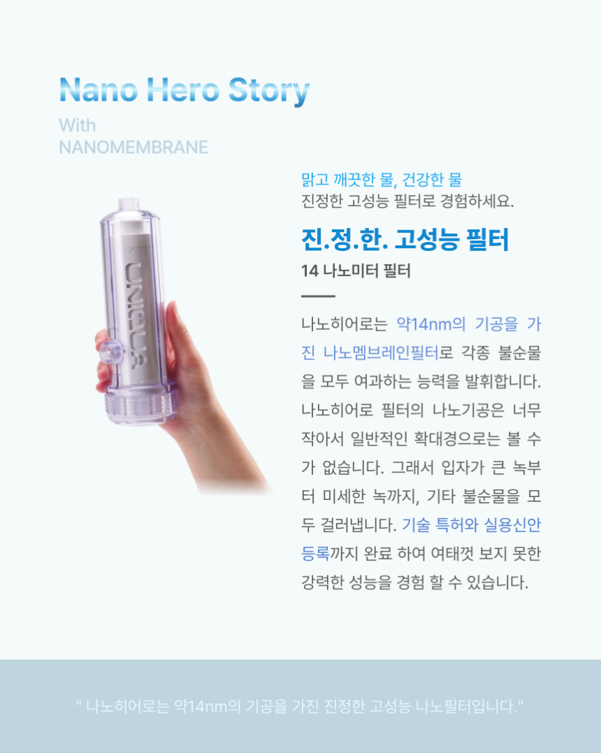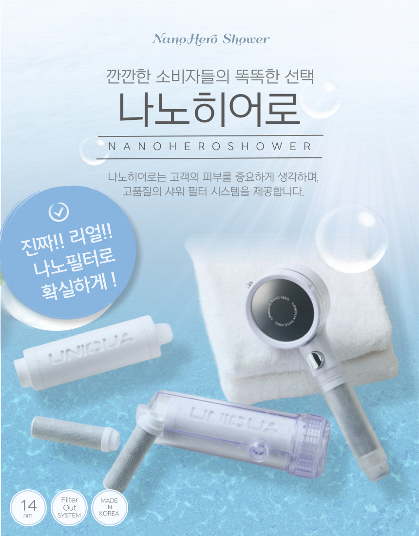 나노 히어로 샤워기는 14nm기공의 나노멤브레인필터로 미세여과를