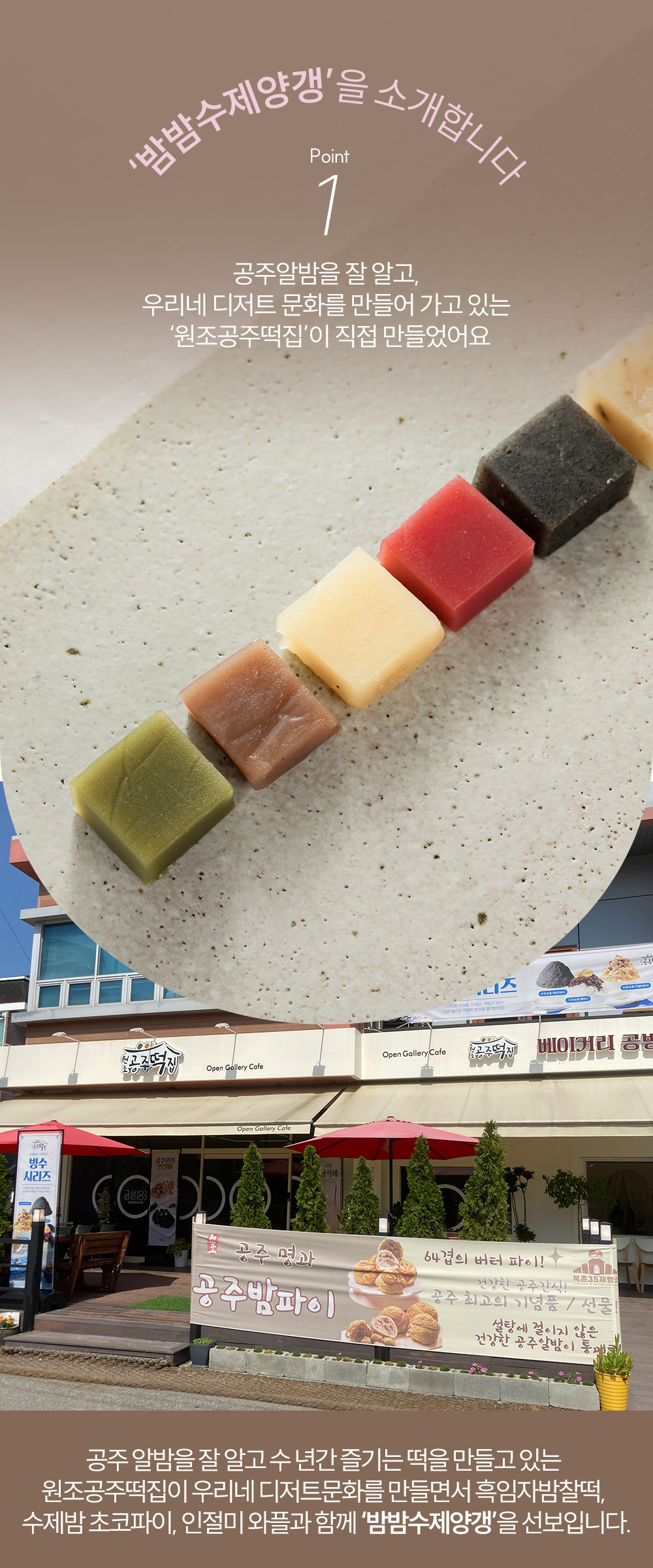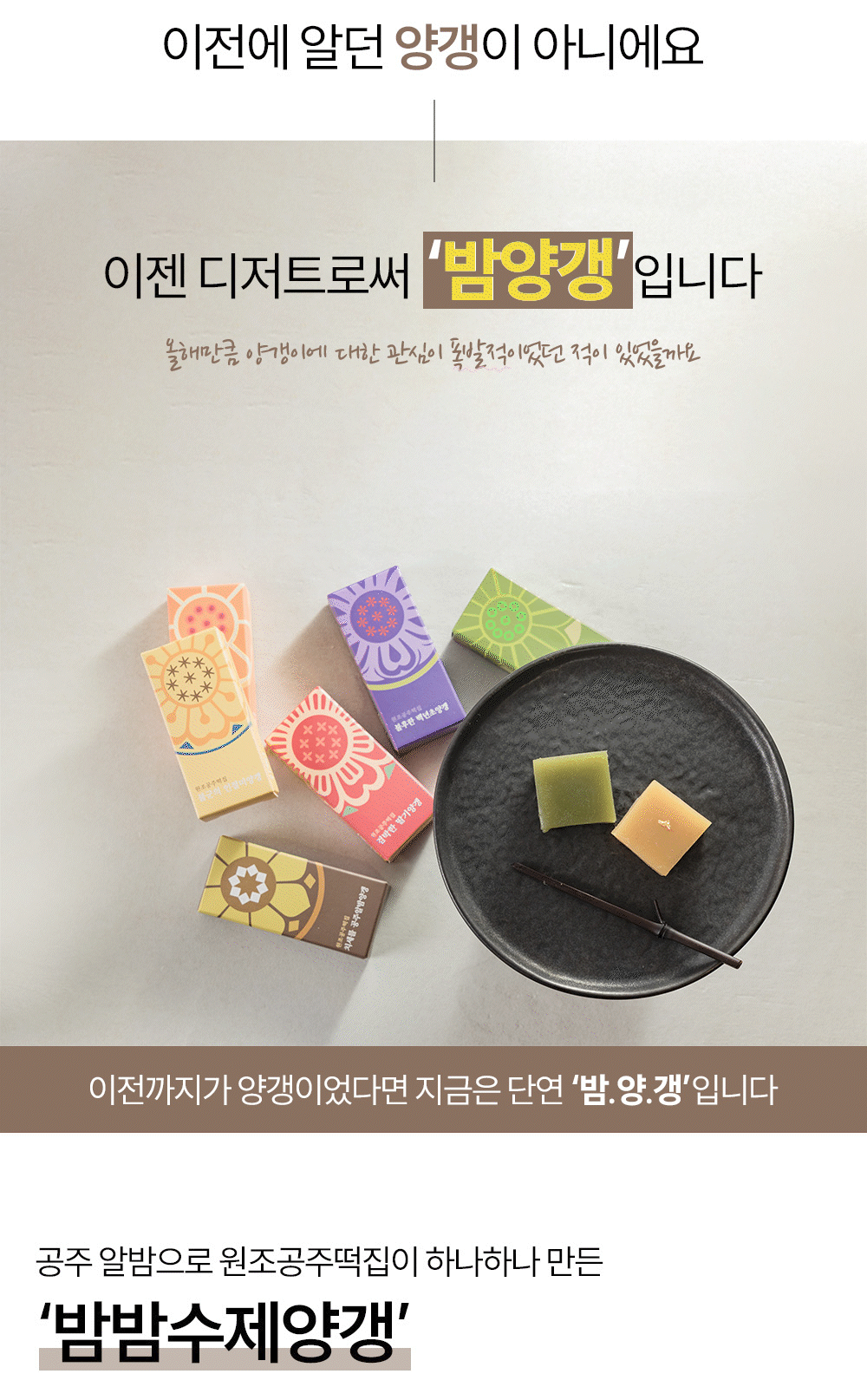 이에, 공주에서의 행복한 순간들을 추억하고 나누며 회상할 수 있는 상품을 개발하고자 공주산성시장협동조합과 원조공주떡집의 합작품으로 ‘밤밤수제양갱’이 탄생했어요.