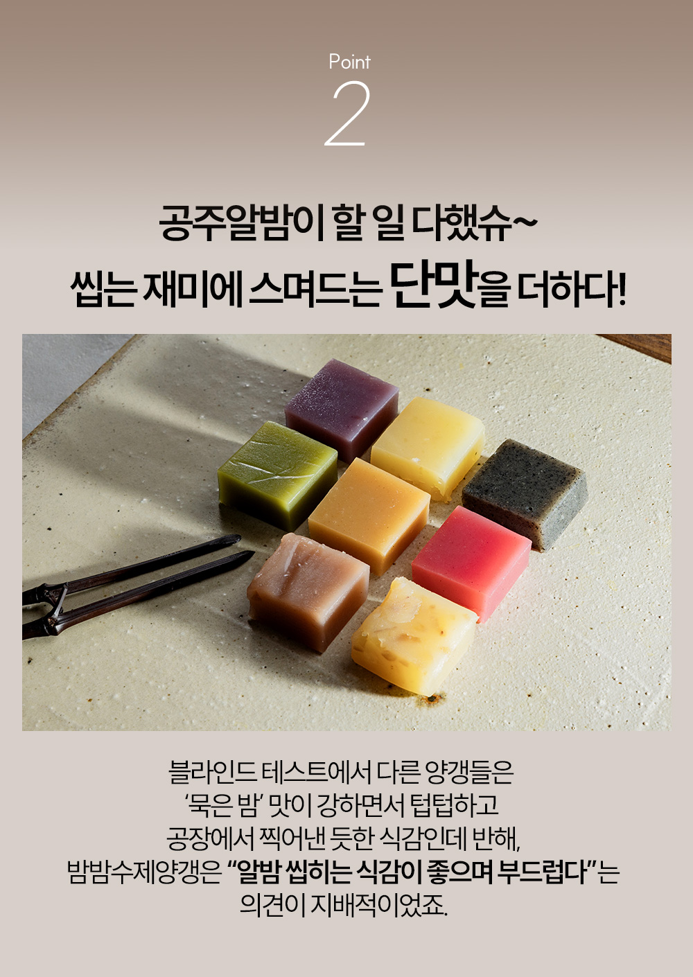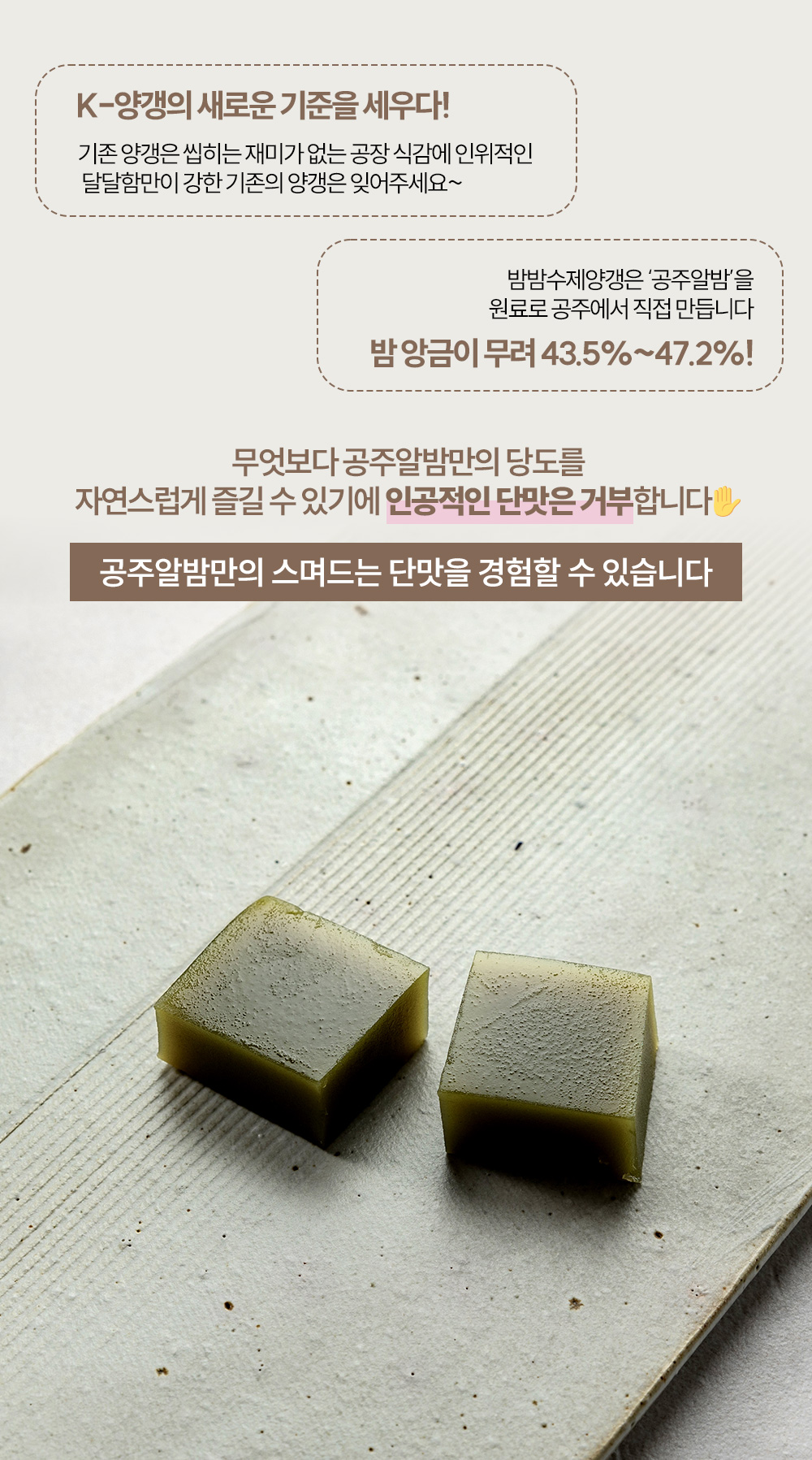 그래서 자연스럽고 부드러운 식감에, 스며드는 알밤의 단맛을 느낄 수 있답니다
