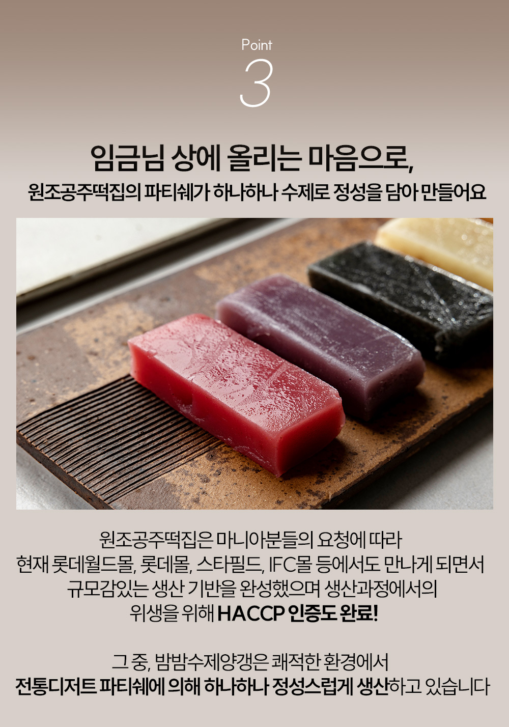 수년간의 떡 및 전통디저트의 제조 기술, 지속적이고 트렌디한 R&D, 디테일한 고객CS 등 전문성과 노하우를 보유하고 있습니다. 무엇보다 엄선된 재료와 엄격하고 깐깐한 품질 및 위생관리, 시골의 정직한 신념으로 하나하나 직접 수제로 만들어 보다 안전하며 고품질의 양갱을 선보일 수 있습니다.