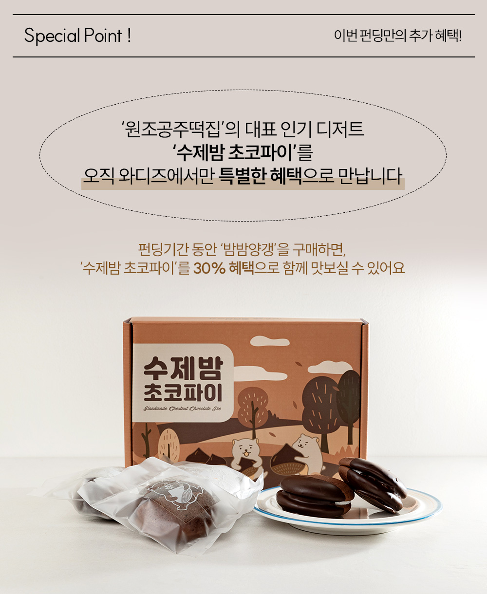 원천과 생각을 갖춘 제품에 대한 이해가 높고 브랜드에 대한 진정어린 응원과 지지가 많은 와디즈이기에, 이번 밤밤수제양갱을 통해 와디즈 서포터님들을 만나고 소통하며 이후 업그레이드 및 신제품 개발에 가이드 라인을 확보하고 싶습니다. 안목 높은 와디즈 서포터님들과 새로운 K-디저트를 즐기는 라이프스타일을 만들어 가고싶습니다.