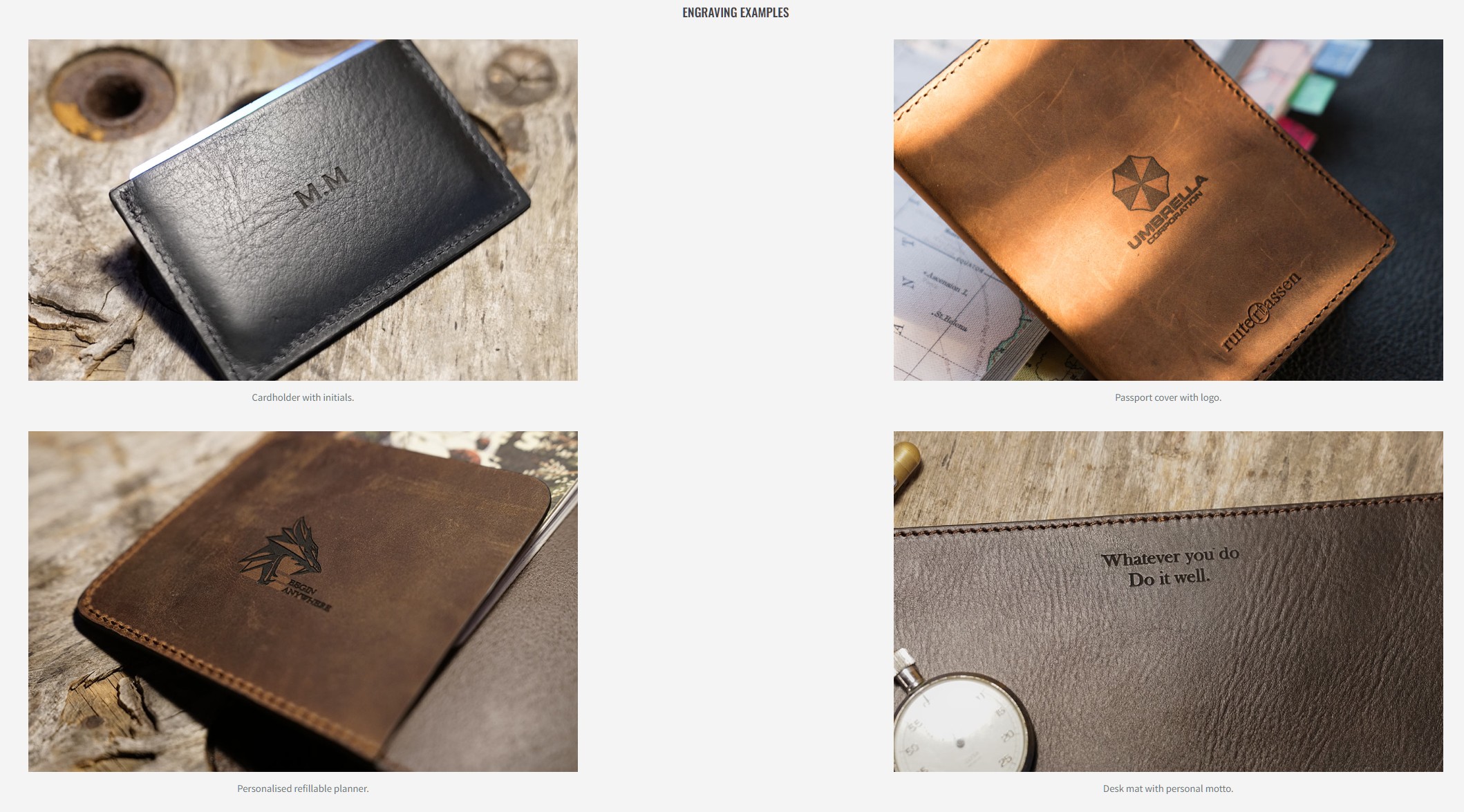 可刻产品: 卡包、公文包、手账本、桌垫等Ruitertassen的主要皮革产品。