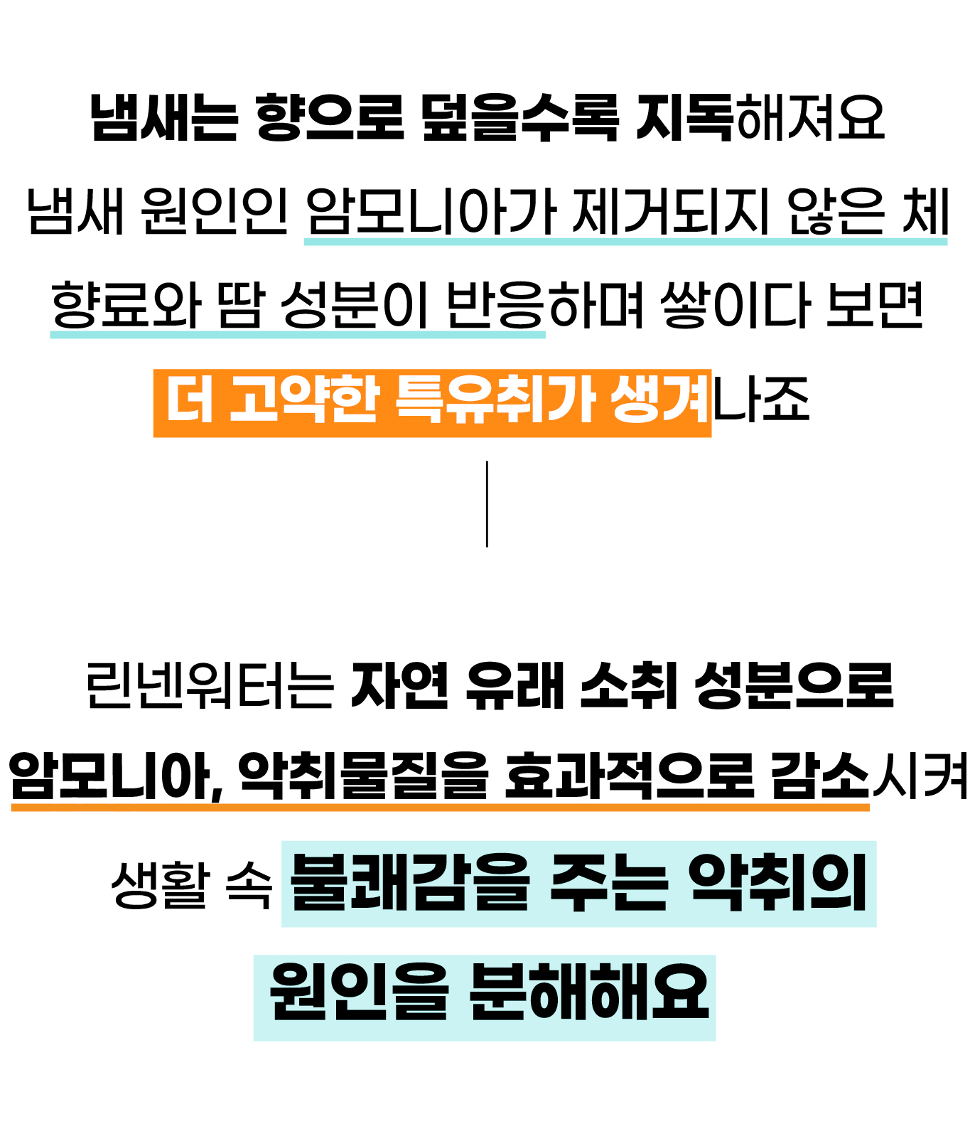암모니아 - 무색의 기체로 자극적인 지독한 냄새가 특징 (화장실 냄새, 땀 냄새, 쉰 냄새 등)