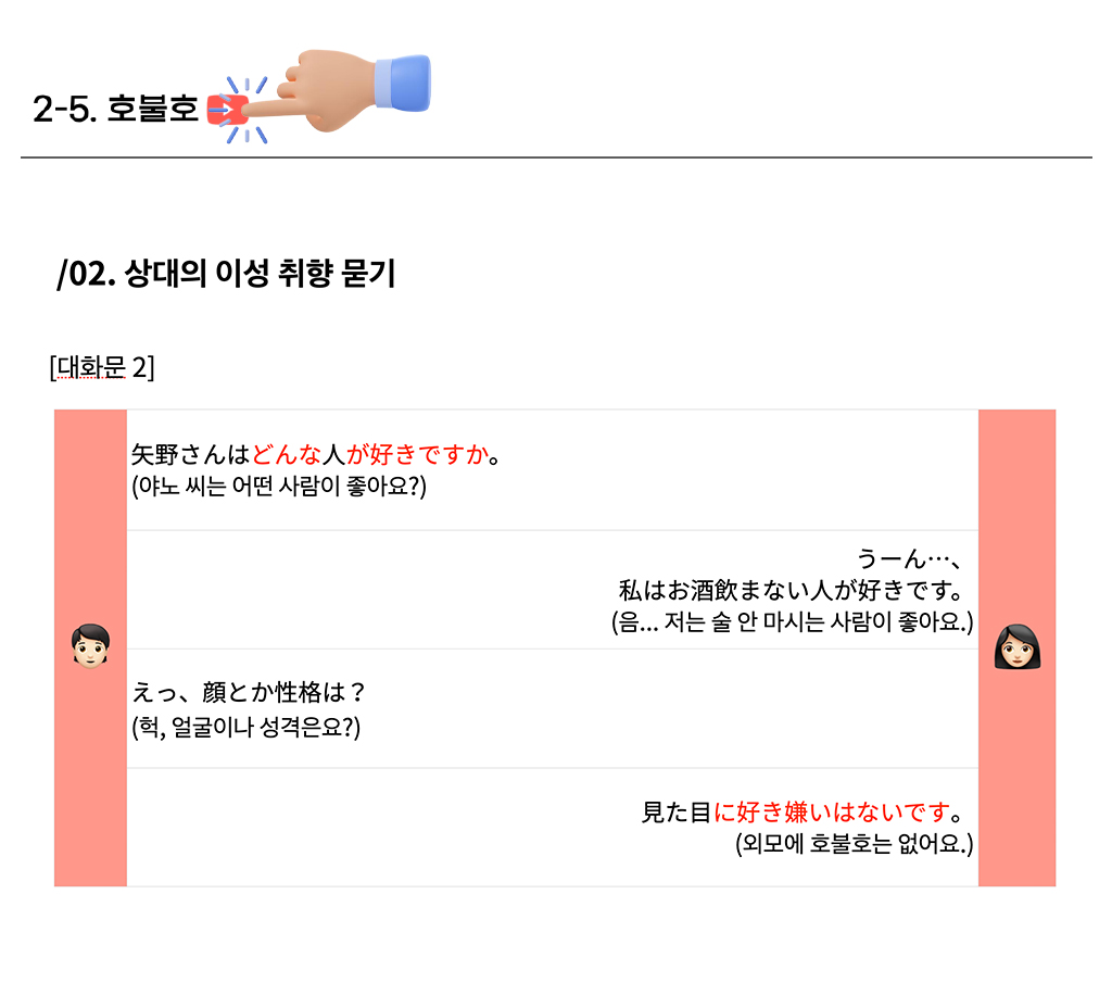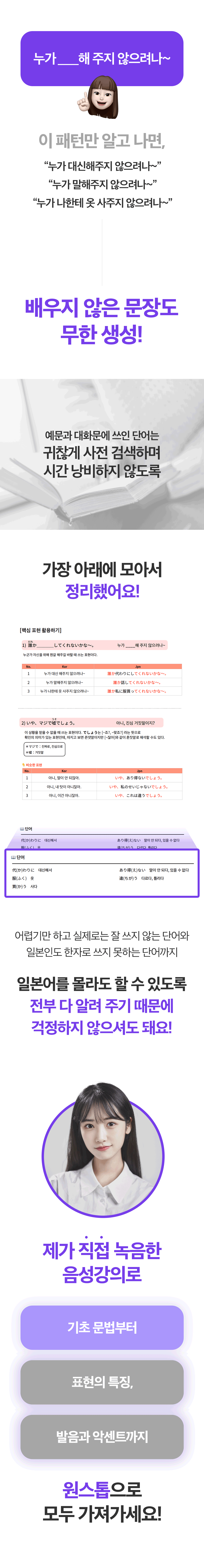 A. 해당 콘텐츠는 ‘리얼 일상 일본어 회화'에 초점을 맞추고 있지만, 비즈니스 파트를 따로 만들어서 제공하고 있어요. 일본은 상황에 따라 또 상대가 누군지에 따라 기본적인 인사말도 달라지는데요. 그러한 세세한 차이점을 리스트업 해 두었답니다! 저는 일본에 취직하기 전에도 일본어 회화는 꽤 자신 있는 편이었는데요. 막상 현장에 뛰어드니 이해가 안 가는 단어들 투성이더라고요. 직접 현장에서 부딪혀보지 않으면 절~대 알 수 없는 표현들도 꼼꼼하게 준비해 뒀으니 걱정 마세요!