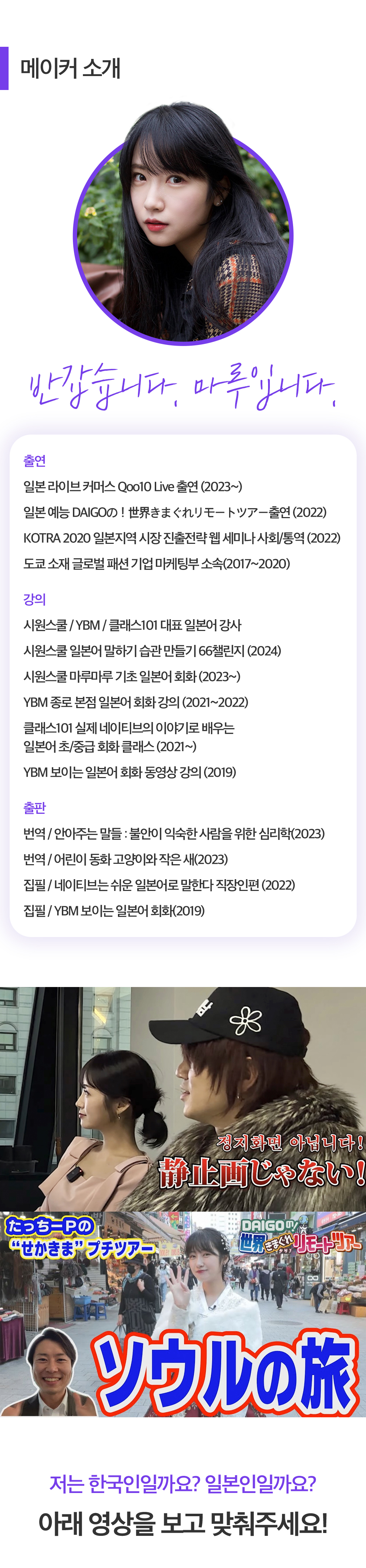일본에서의 직장 생활과 일본인과의 장기 연애로 이름을 말하기 전까지는 한국인인 줄 모를 정도로 자연스러운 일본어 구사력은 물론, 정확한 발음, 악센트까지 모조리 알려 드립니다.