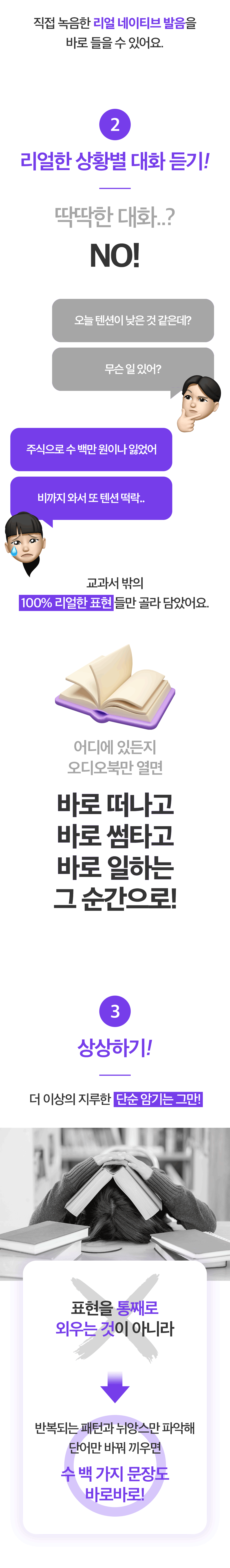 A. 히라가나, 가타카나의 암기가 되어 있고 어느 정도 기초 문법을 알고 계신 분들이라면 오디오북 A, B(일본어 기초 회화 & 리얼 네이티브 표현)로 리얼 네이티브 회화로 바로 들어갈 수 있어요. 실제 일본인들이 일상생활에서 사용하는 생동감 넘치는 표현을 여러 상황에 알맞게 학습할 수 있죠! 기본적인 인사부터 연인과의 싸움, 혼잣말까지! 수십 가지의 상황을 리얼한 회화문과 예문을 통해 학습할 수 있어요. 만약 아직 글자 암기나 기초 문법이 잡히지 않은 분들이 계시다면, 오디오북C, D(왕초보자를 위한 일본어 기초 문법)를 통해 기초 문법부터 중급 문법까지 예습, 복습을 할 수 있어요. ‘나아직 문법 잘 모르는데…’하는 걱정은 넣어두셔도 좋아요!