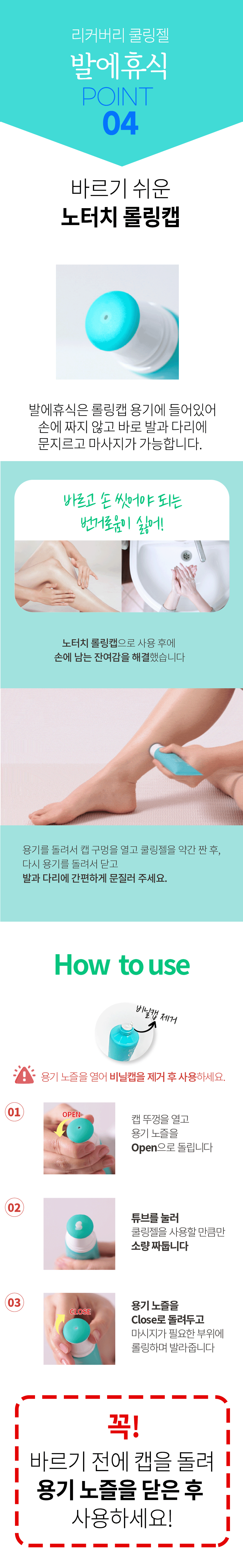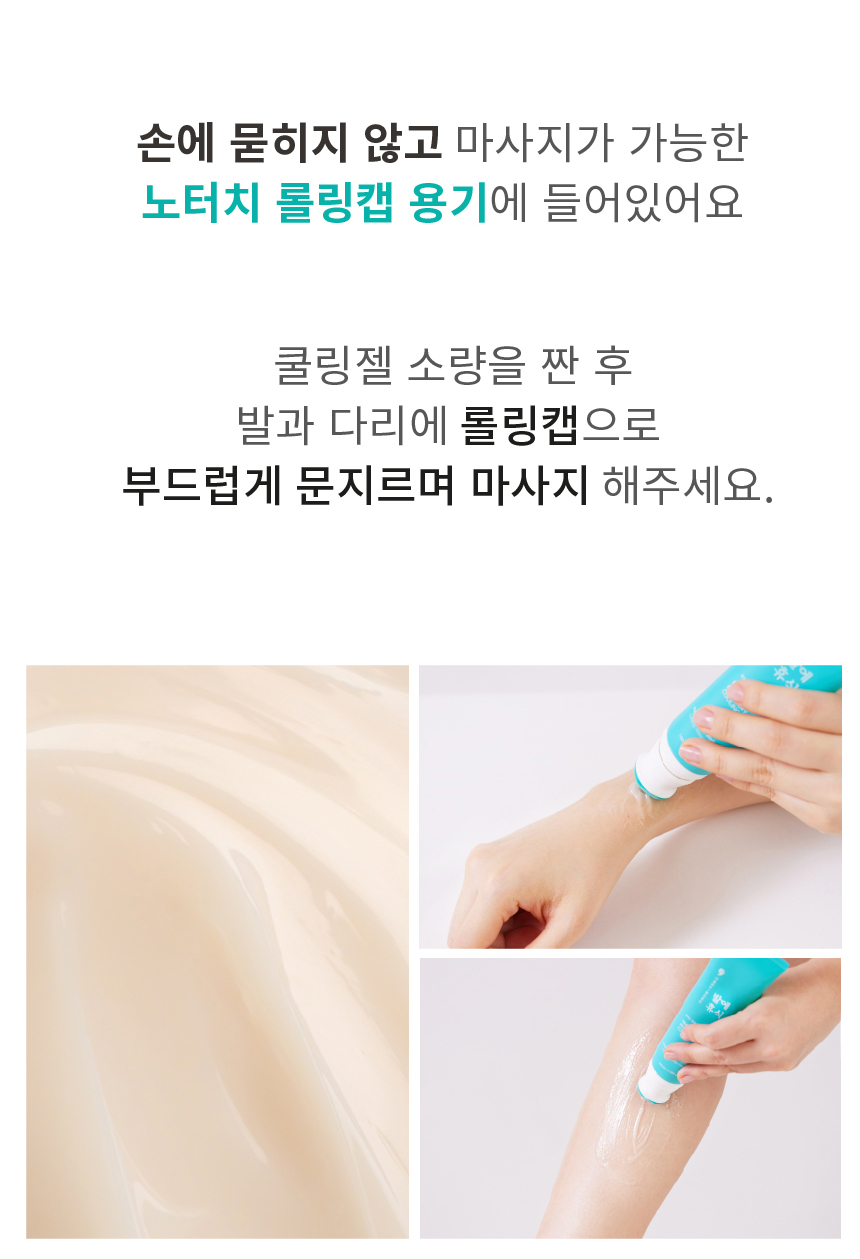 손에 묻는 것도 싫다 하시는 분은 용기 캡부분을 돌려서 젤을 짠 후 캡을 닫고 그대로 발과 다리에 문지르면서 마사지 해주셔도 되요.