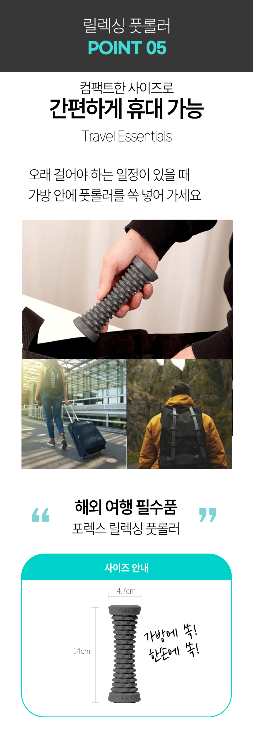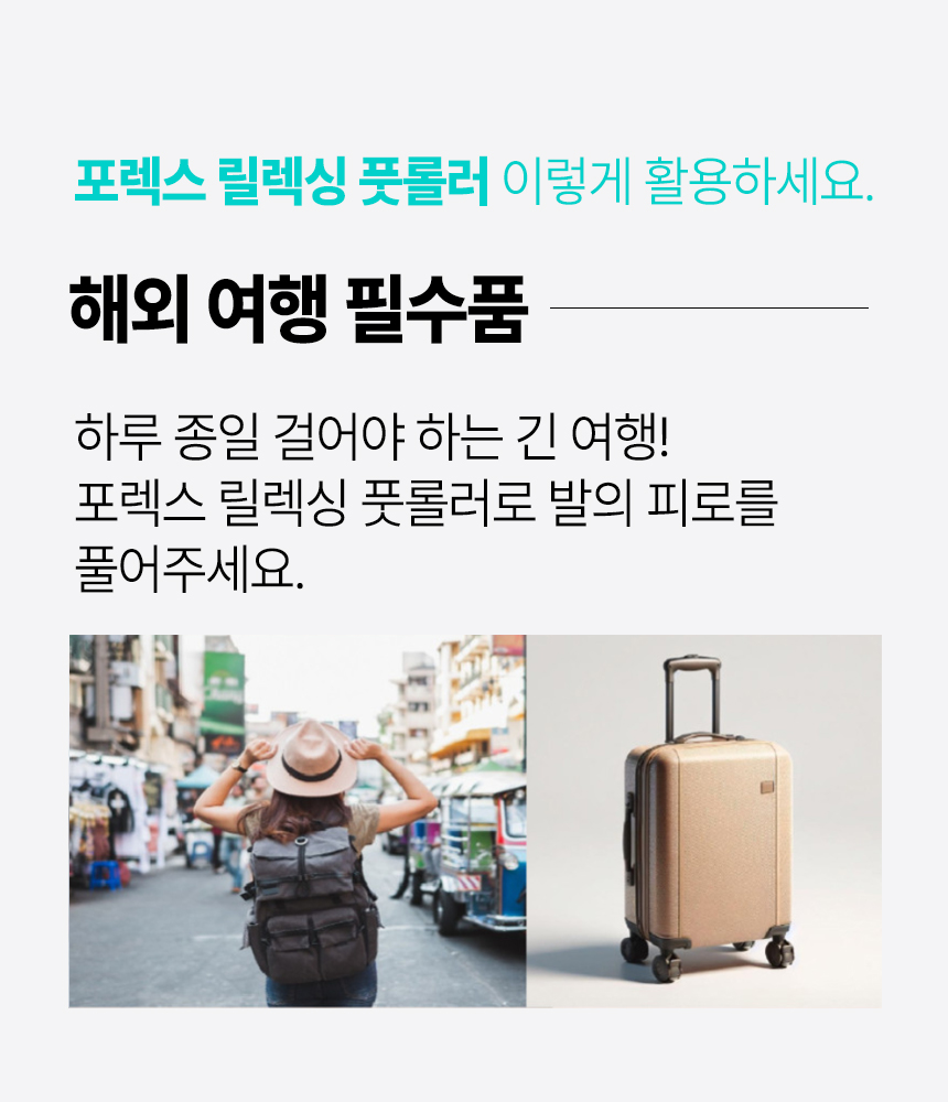 걷는 시간이 많은 여행에서는 그 피로는 그 날 풀어줘야 해요. 숙소에 돌아와서 포렉스 릴렉싱 풋롤러로 가볍게 발마사지 해주세요.