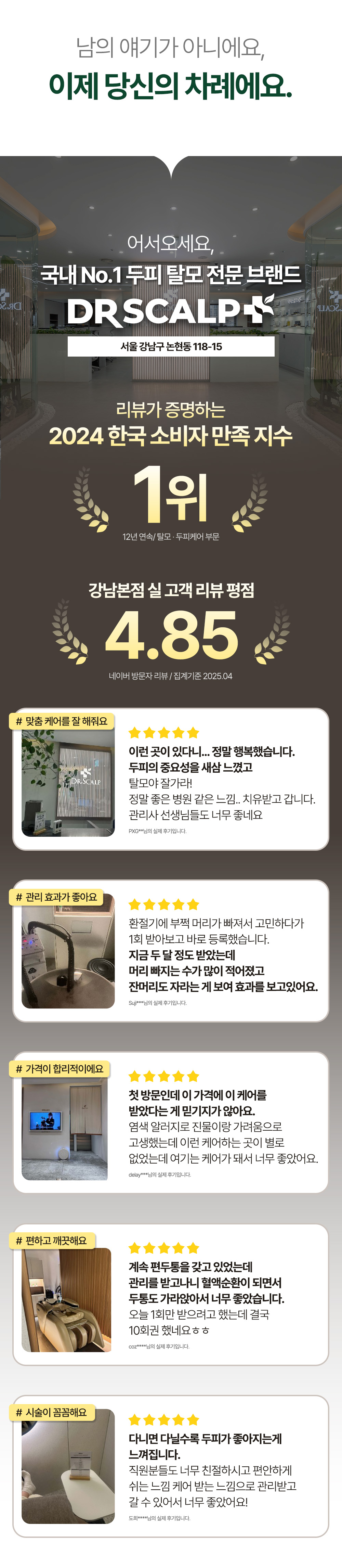 탈모는 쉽사리 좋아지지 않았고, 더욱 악화가 되어 저는 탈모 관리를 시작해야 겠다고 마음 먹었습니다. 예전에는 탈모에 대한 정보도 아주 부족했던 시기여서, 혼자 탈모에 대해 공부하며 탈모 지식을 쌓아가기 시작하였습니다. 엄청난 노력과 연구에 보상을 받은 것처럼, 저는 스스로 탈모를 이겨낼 수 있었습니다. 저의 이러한 실 탈모 경험과 관리 노하우, 대학 및 현장에서의 지식들이 지금의 닥터스칼프를 만든 것 같습니다.