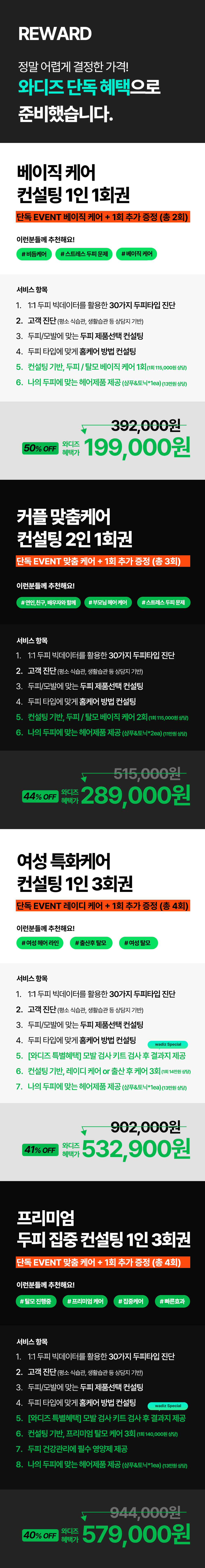 7. 현장에서의 두피 케어 컨설팅 내용에 따라, 와디즈에서 펀딩하신 내역과 케어어 내역이 달라질 수 있습니다.추가 케어를 받아 보시기로 원하신다면 그에 따른 추가 금액이 발생할 수 있습니다.
