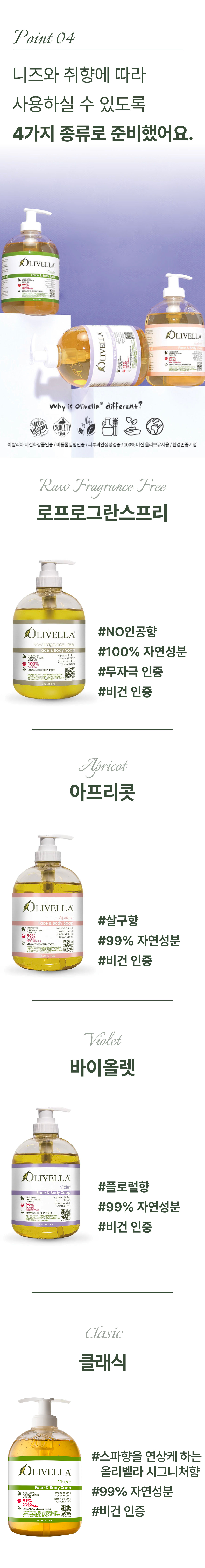 A. 올리벨라 페이스 바이 리퀴드 솝은 The one & only 100% virgin olive oil 라는 모토하에 엄격한 심사를 거친 100% 버진 올리브 오일만을 선별하여 사용합니다. 단가를 맞추기 위한 낮은 등급의 올리브오일은 사용하지 않았습니다