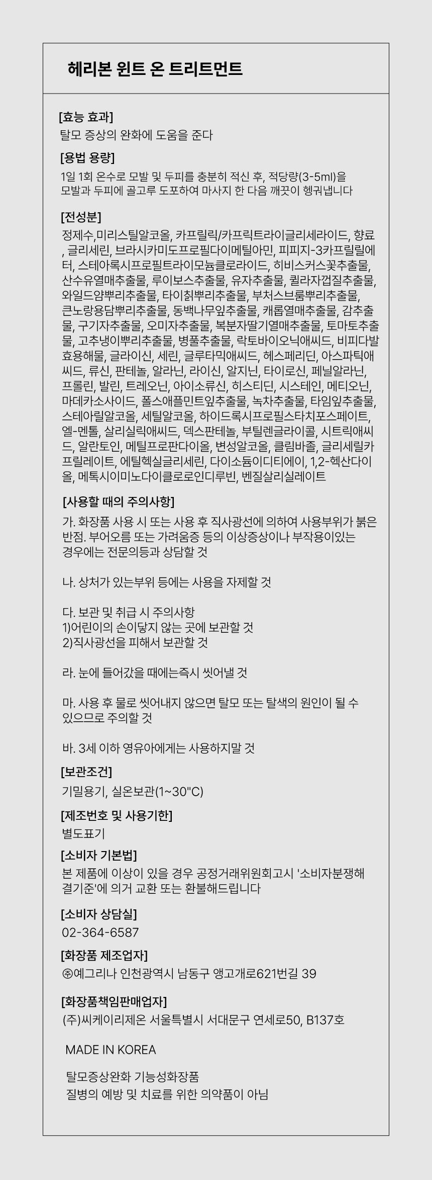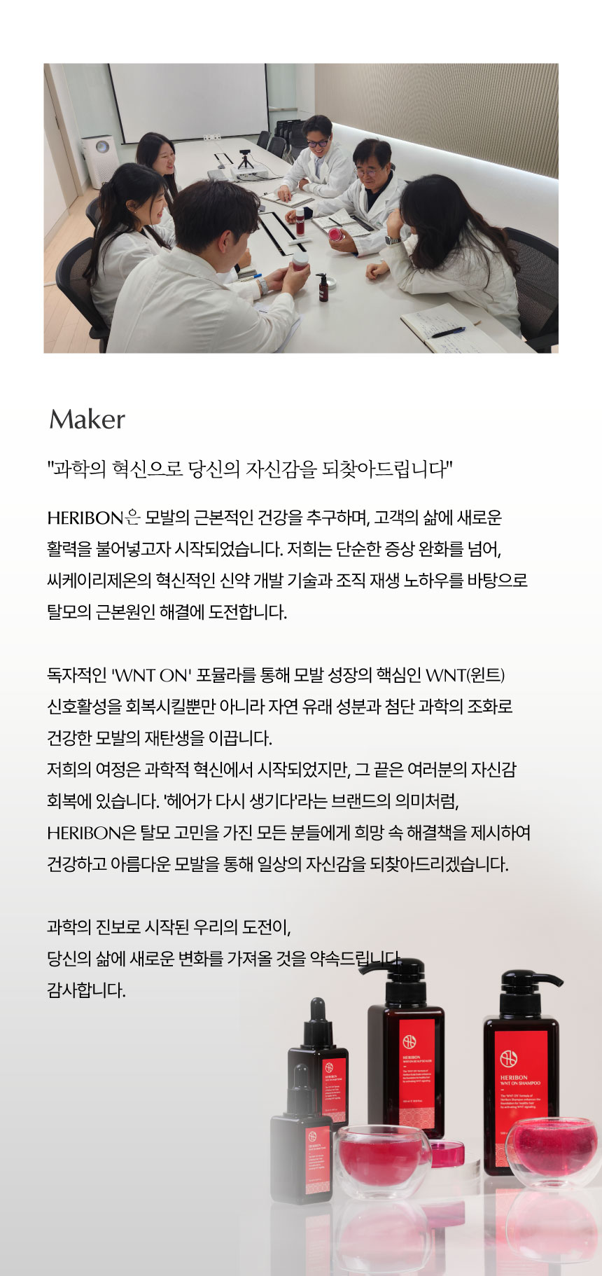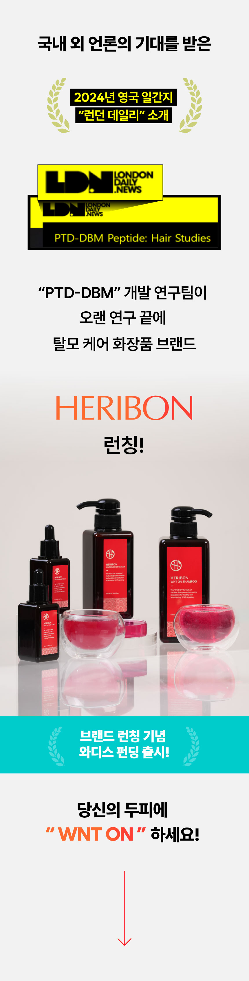 시중에 정말 많고 많은 식약처 고시 기능성 성분만을 함유해서 만든 탈모완화 기능성 화장품으로, 또 과대광고 및 돈만 주면 만들어주는 임상시험 결과들로 제품을 포장하여 판매하고 싶지 않았습니다. 우리의 이야기를 하고 싶었고 헤리본의 가치를 알리고 싶었습니다. 그에 와디즈를 선택하게 되었습니다. 와디즈의 서포터분들은 단순한 소비자가 아닌, 제품의 가치를 알아보는 안목과 브랜드의 방향성을 궁금해하시는 분들이라고 생각했습니다. 헤리본은 와디즈를 통해 서포터 여러분들에게 가치를 인정받고, 성장해나가고 싶습니다.