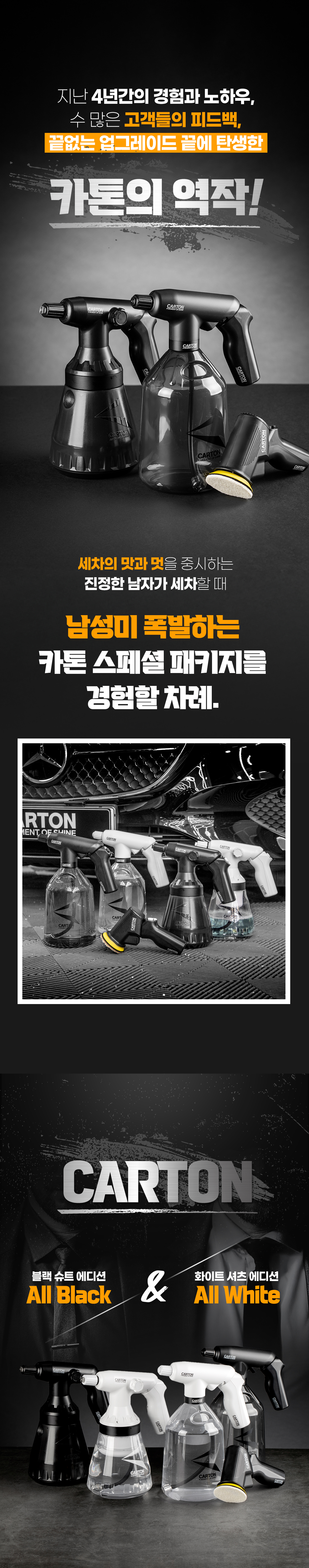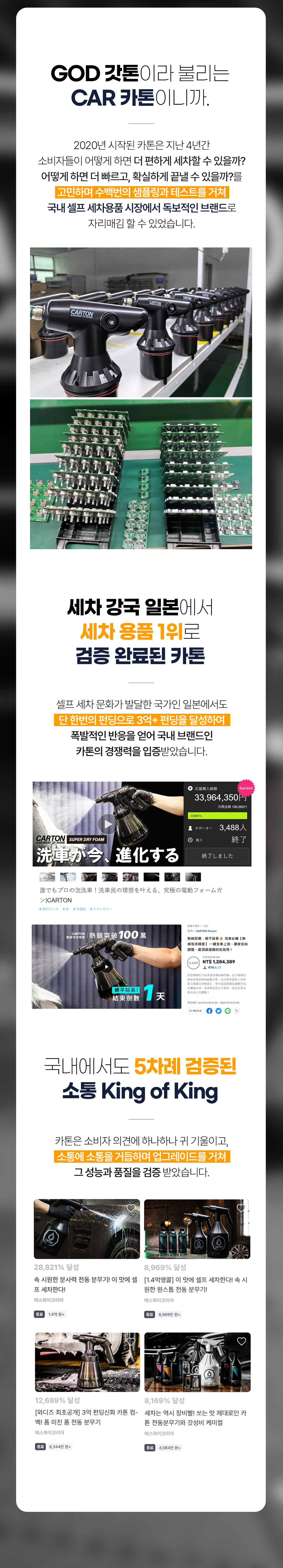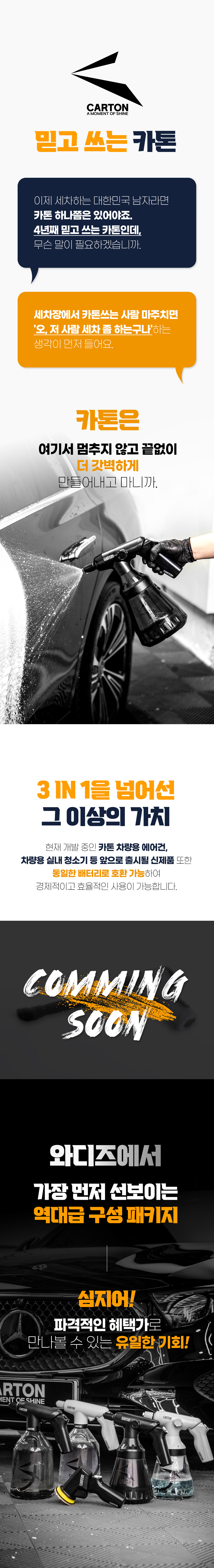 카톤이라는 브랜드는 국내 세차시장내에 분무기 부분에서 독보적인 자리를 하고 있는 브랜드로써 이미 와디즈에서 5차례 진행된 프로젝트에 모두 성공하였으며 최근 대만, 일본 등에서도 폭발적인 반응을 보이고 있습니다.