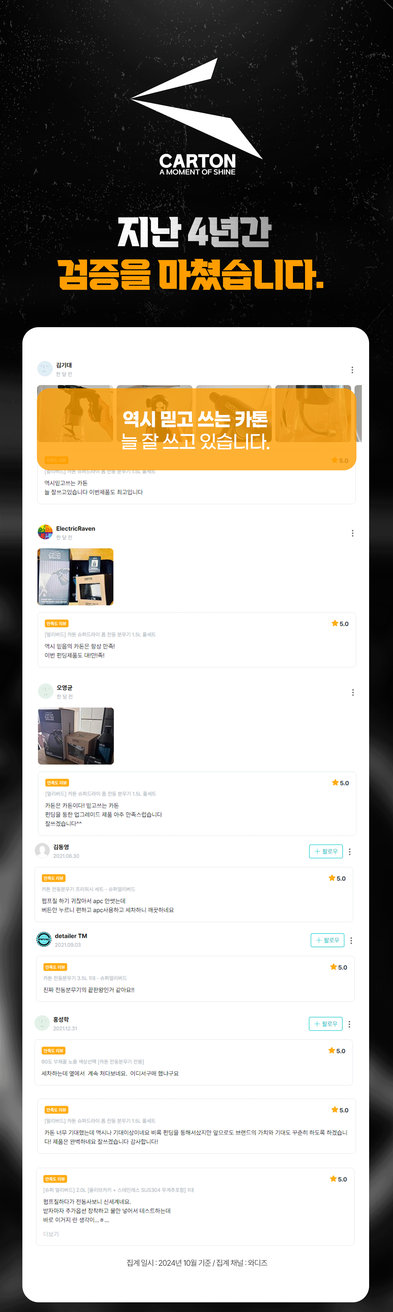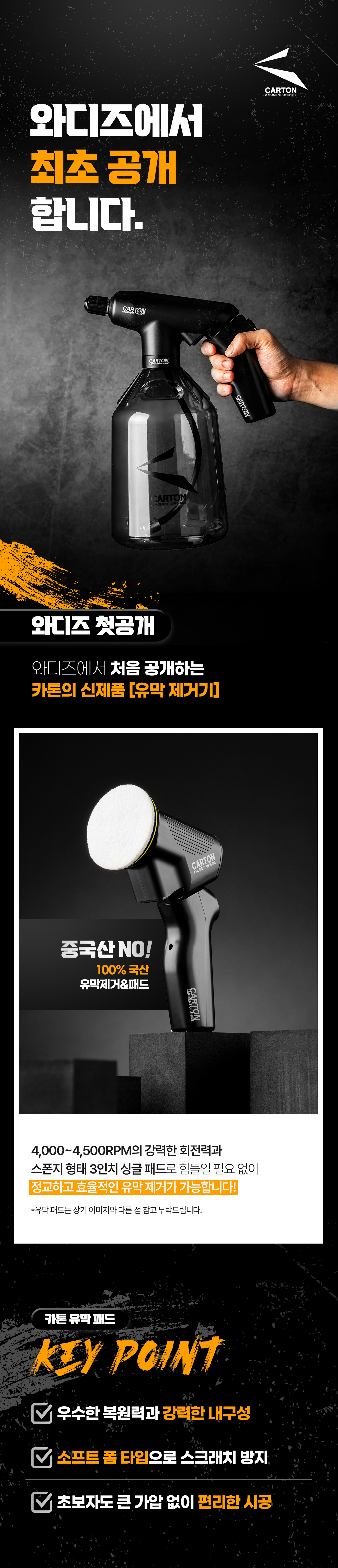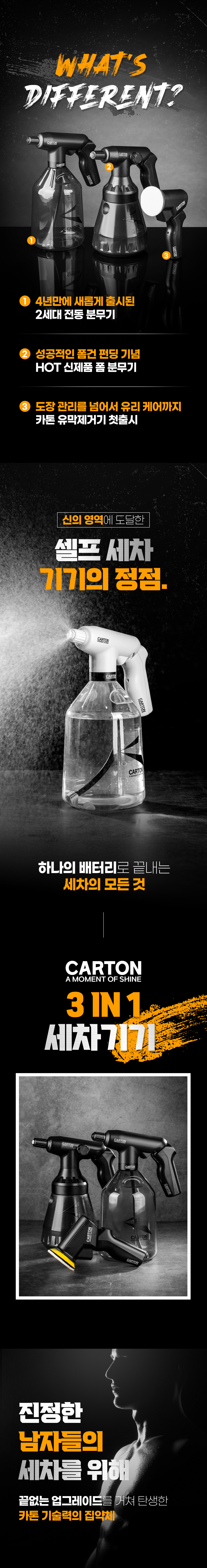 카톤이라는 브랜드는 국내 세차시장내에 분무기 부분에서 독보적인 자리를 하고 있는 브랜드로써 이미 와디즈에서 5차례 진행된 프로젝트에 모두 성공하였으며 최근 대만, 일본 등에서도 폭발적인 반응을 보이고 있습니다.