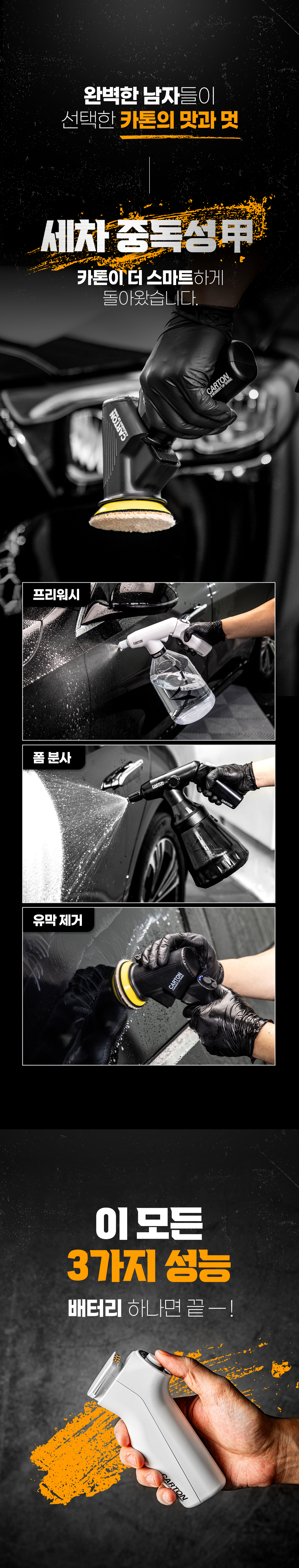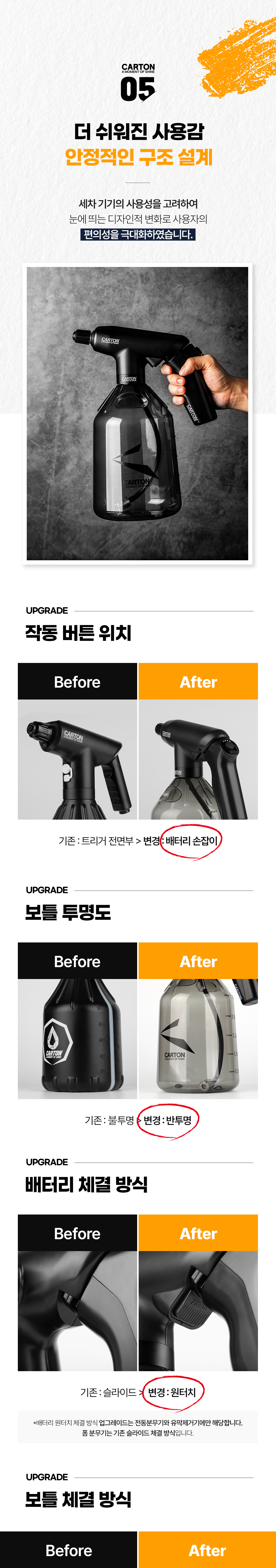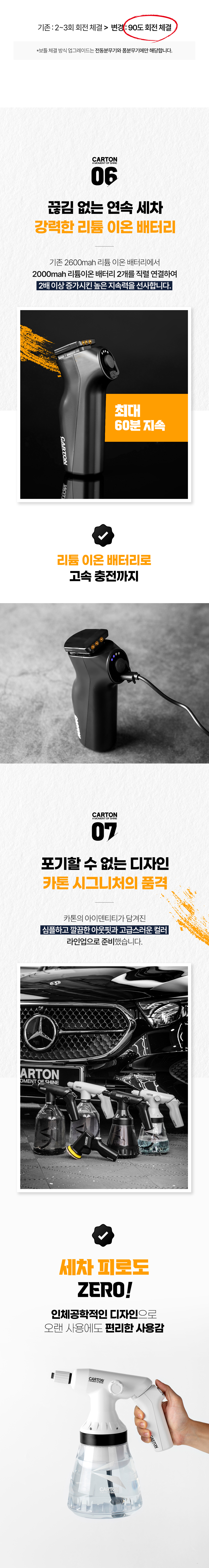 최근 성공적으로 종료된 카톤 슈퍼드라이 폼 전용 분무기의 경우 에스와이코리아에서 처음 적용한 배터리 분리형태의 제품으로, 기존의 프리워시용 1세대 제품을 업그레이드한 프리워시용과 유막제거기 제품을 출시하여 3 in 1의 형태로 제품 라인업을 구성했습니다. (기존 : 트리거 충전 / 변경 : 손잡이 배터리)