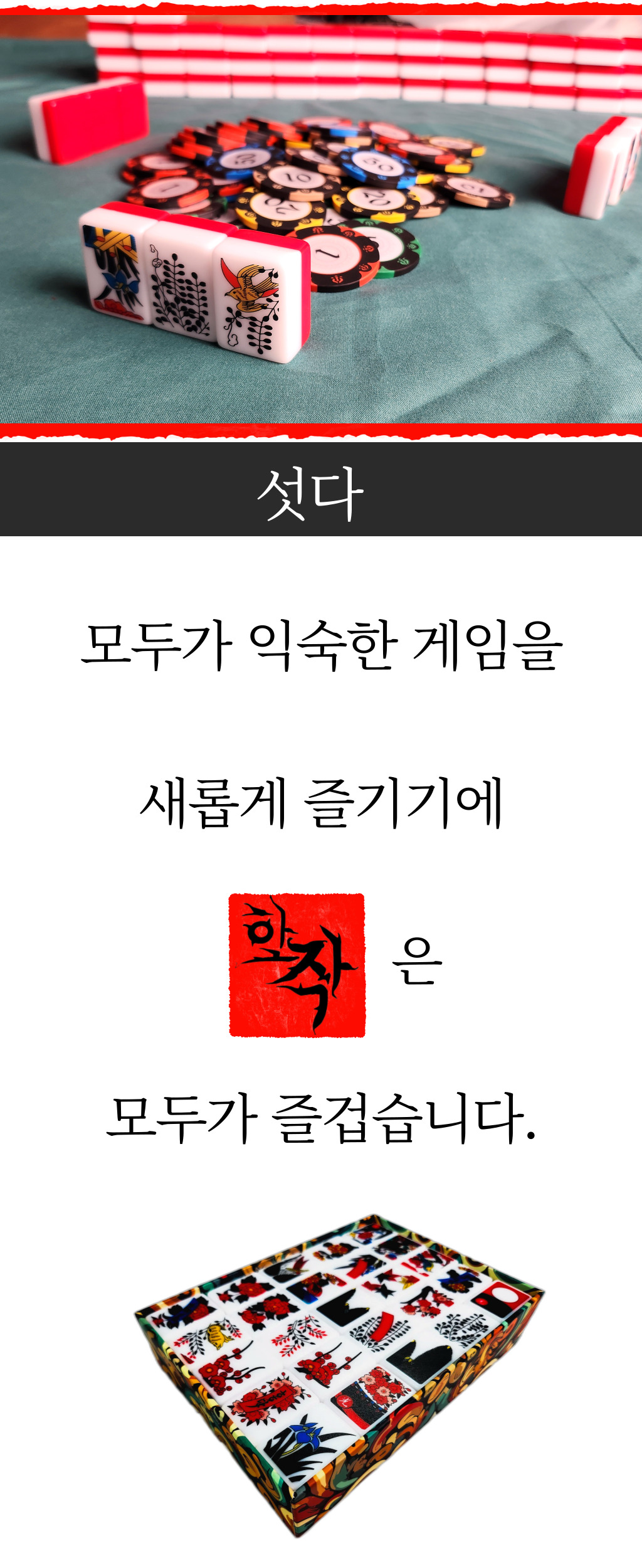 麻将牌与花牌的完美结合。告别塑料花牌,用麻将的手感体验全新但熟悉有趣的花牌游戏合作版。