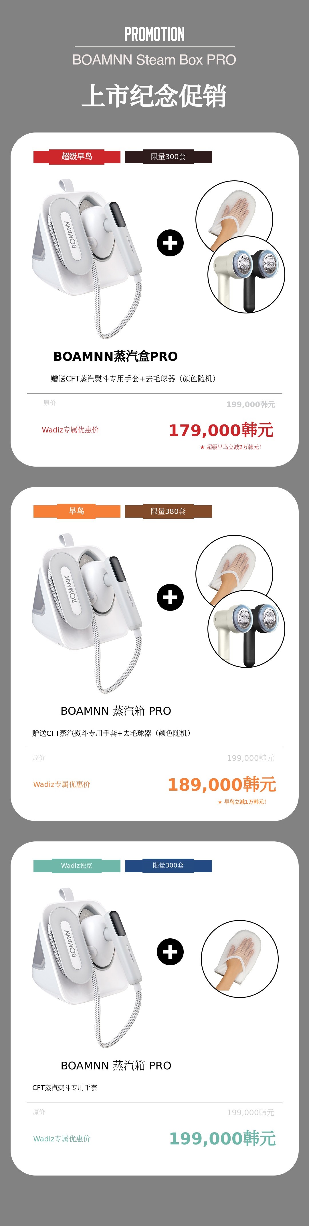 1. 🧥 第二代蒸汽熨斗SteamBox PRO - 干蒸2合1功能,适用多种面料 2. ⚡ 快速预热大容量水箱 - 30秒预热,1150mL水箱长时间使用 3. 🎁 WADIZ独家限量优惠 - 300台限量优惠赠送专用手套