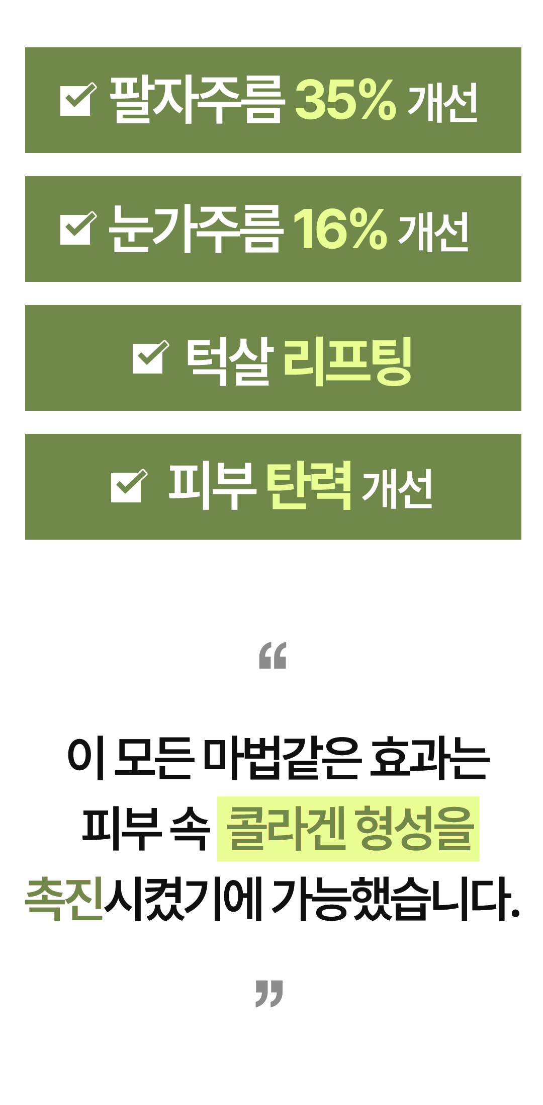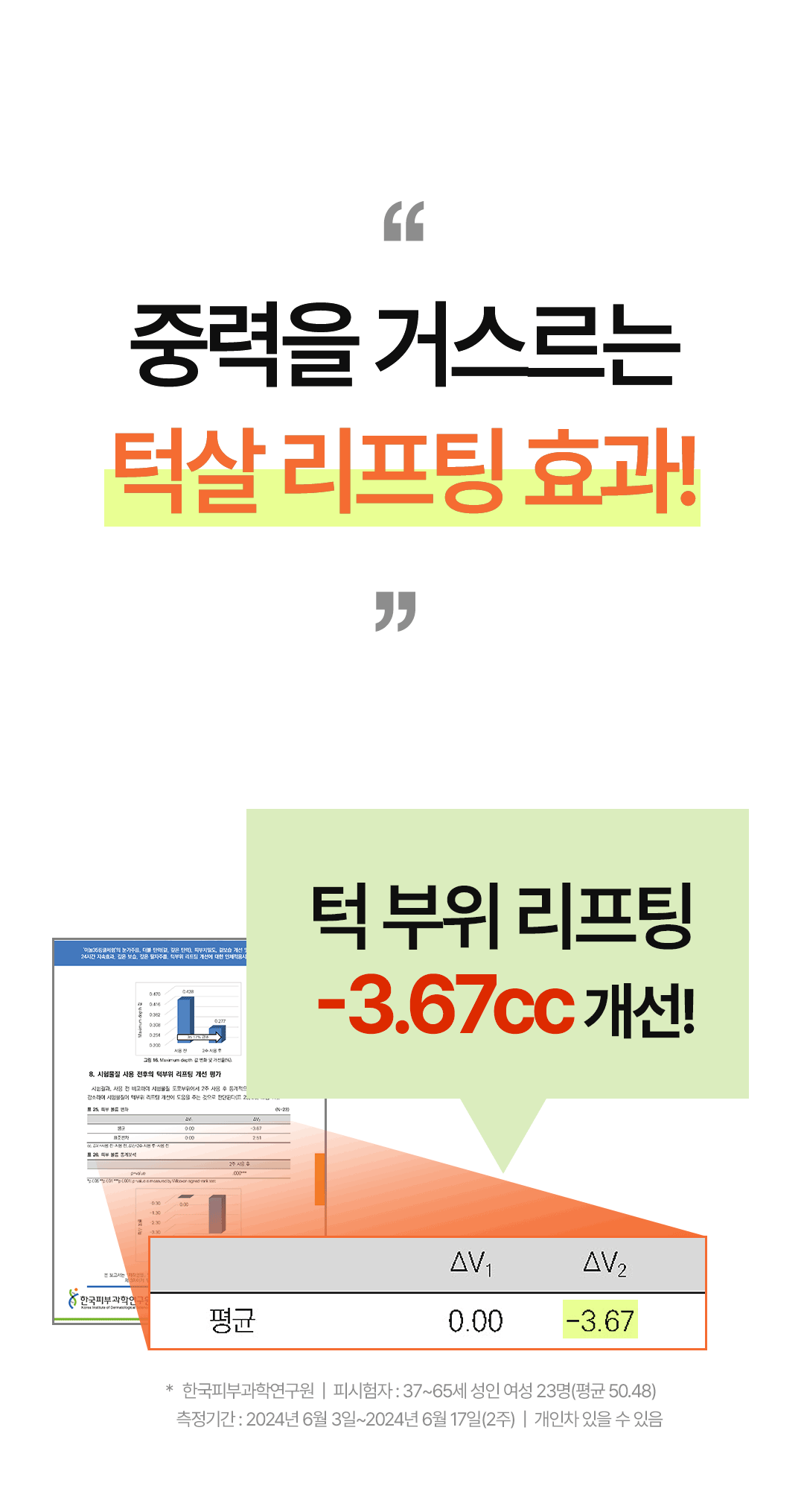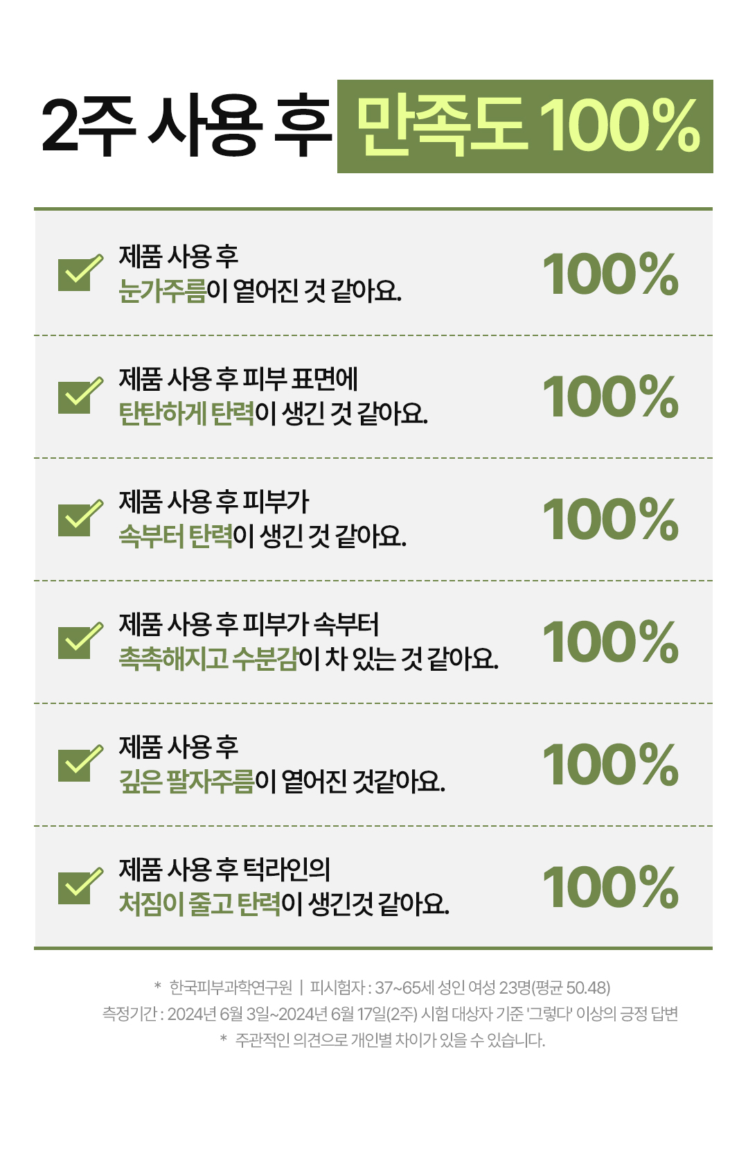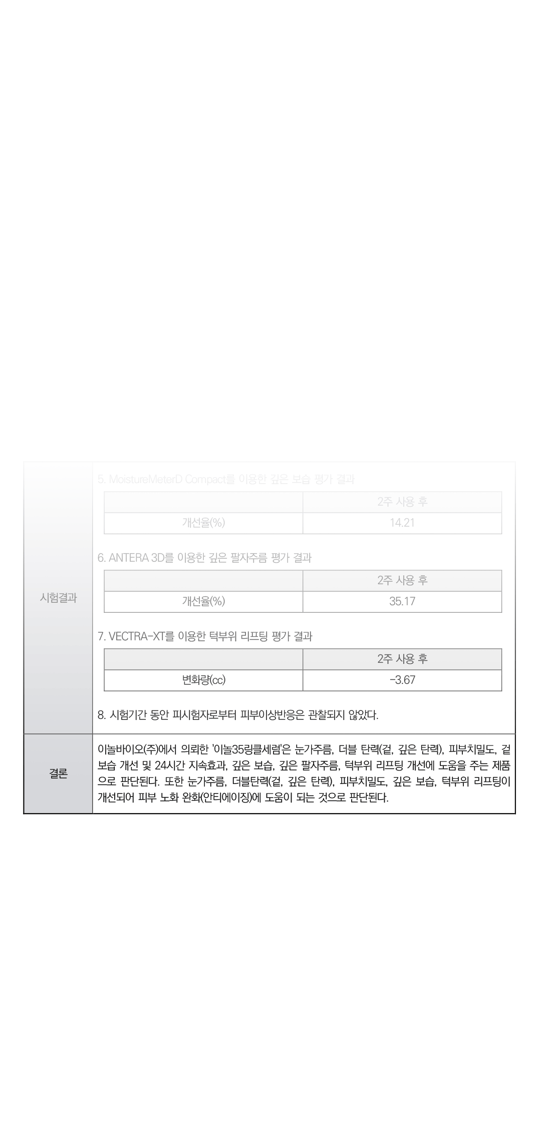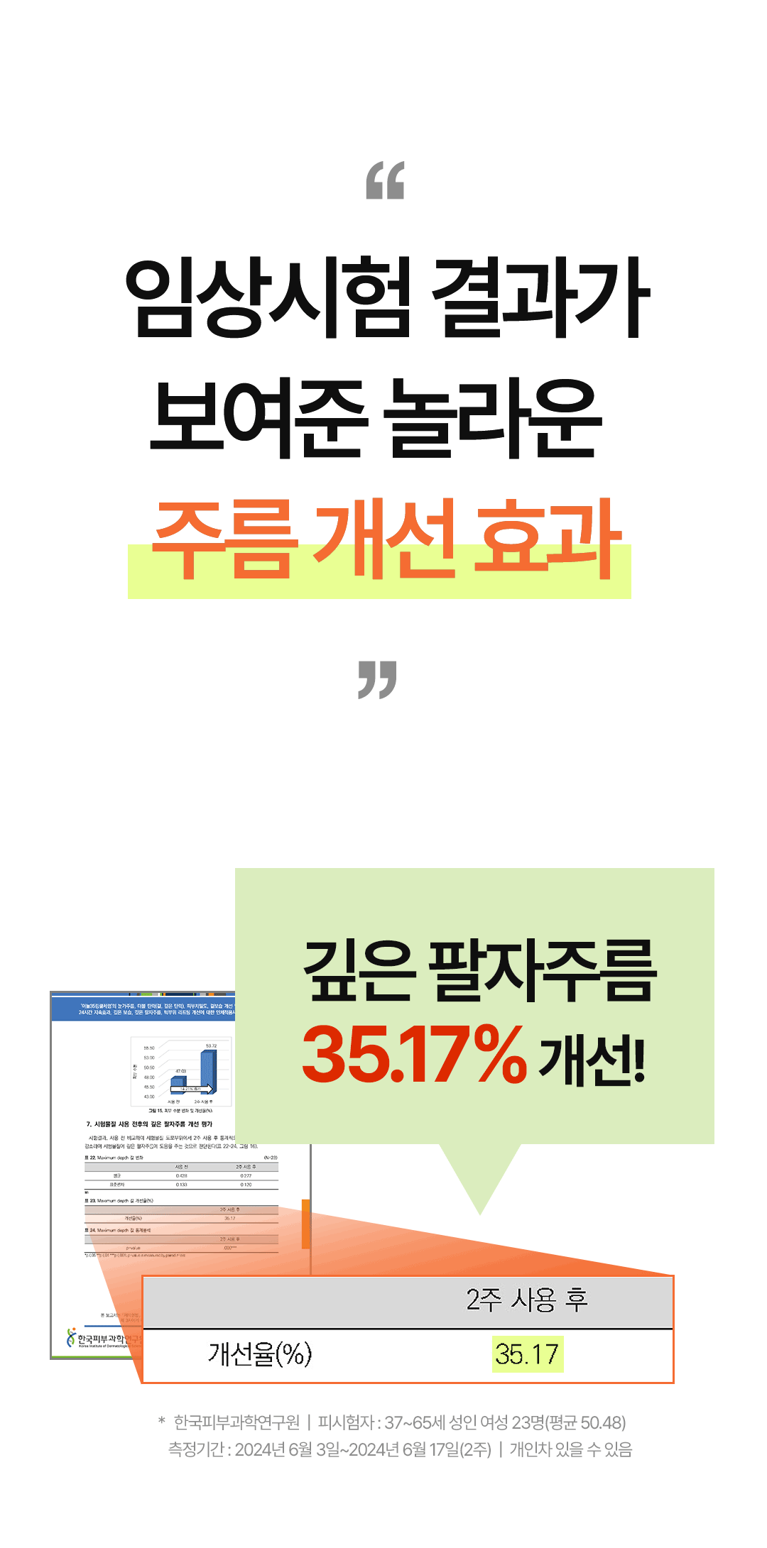 10개 항목의 임상시험을 거쳤으며, 저희뿐만 아니라 임상 시험기관에서도 주름개선 효과에 큰 놀라움을 표했습니다. 35% 이상의 주름개선의 놀라운 임상시험 결과는 저희 제품의 높은 품질과 성능을 입증하는 “안티에이징 세럼"입니다.