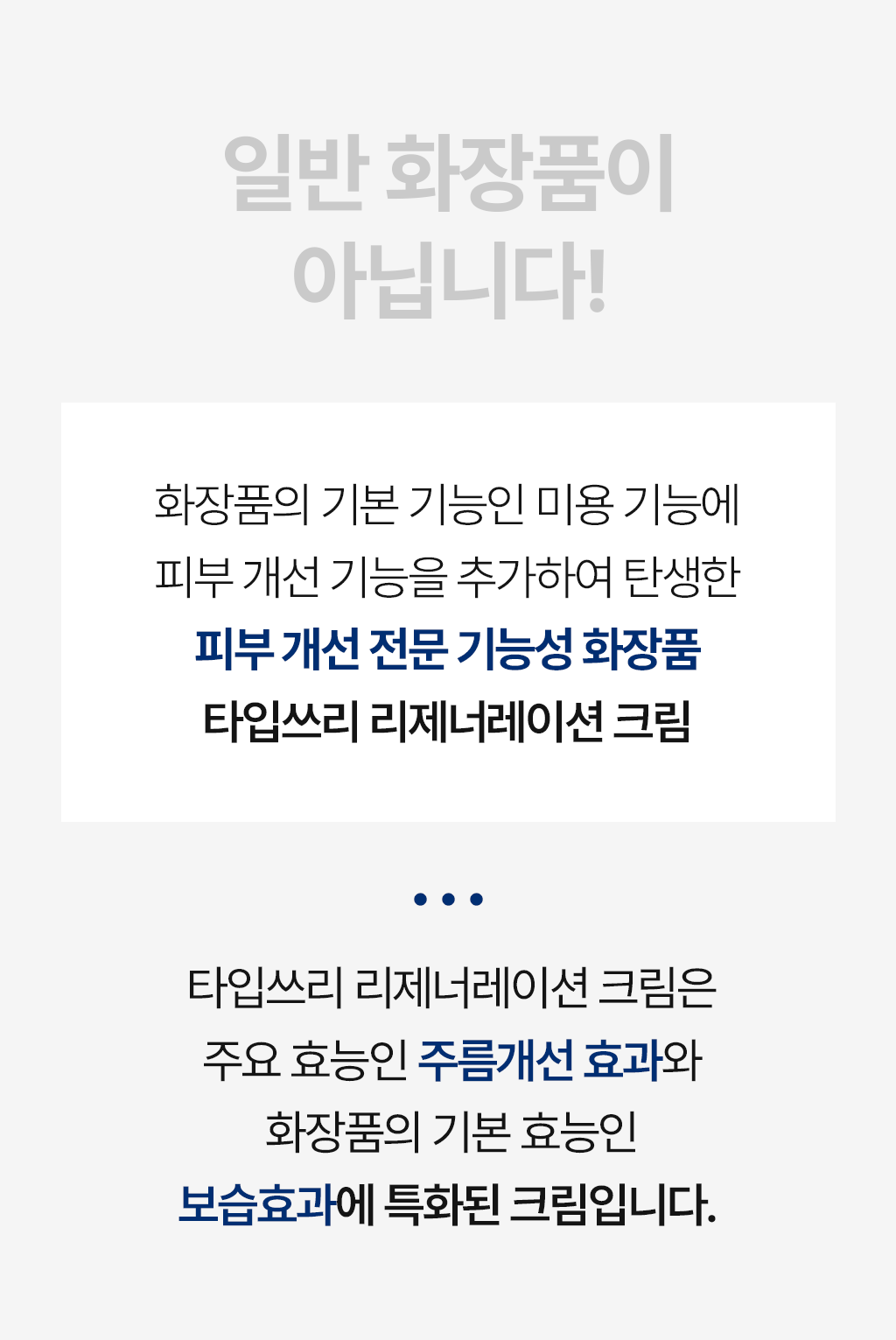 - 리제너레이션 크림은 피부 주름 개선에 집중하여 개발한 제품이며, 이 효능에 가장 적합한 제형과 사용감을 오랜 시간 동안 연구했습니다. 탄탄하고 쫀쫀한 제형 개발을 통해 물리적인 리프팅 효과를 경험할 수 있으며, 유효 성분의 침투를 위해 피부 밀착력과 흡수력을 높였고, 탄력 효능이 유지되도록 속보습과 보습 지속력을 강화하는 데 중점을 두었습니다.