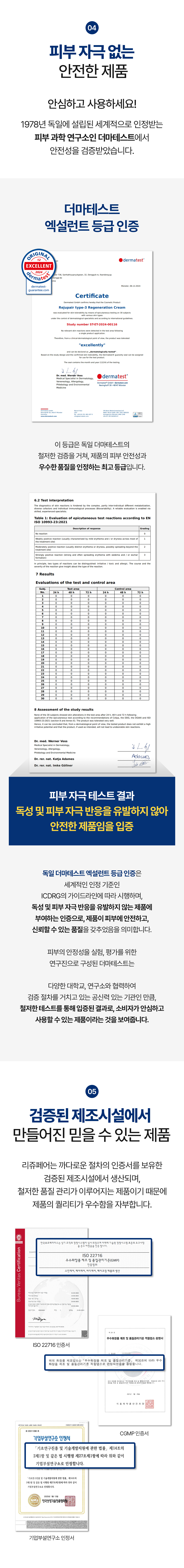 - 단상자 뒷면에 '사용할 때의 주의사항'이 있으니, 사용 전에 반드시 숙지해 주시기 바랍니다. 리제너레이션 크림은 독일더마테스트 엑설런트 최고 등급을 받았기 때문에 안심하고 사용하셔도 좋습니다.