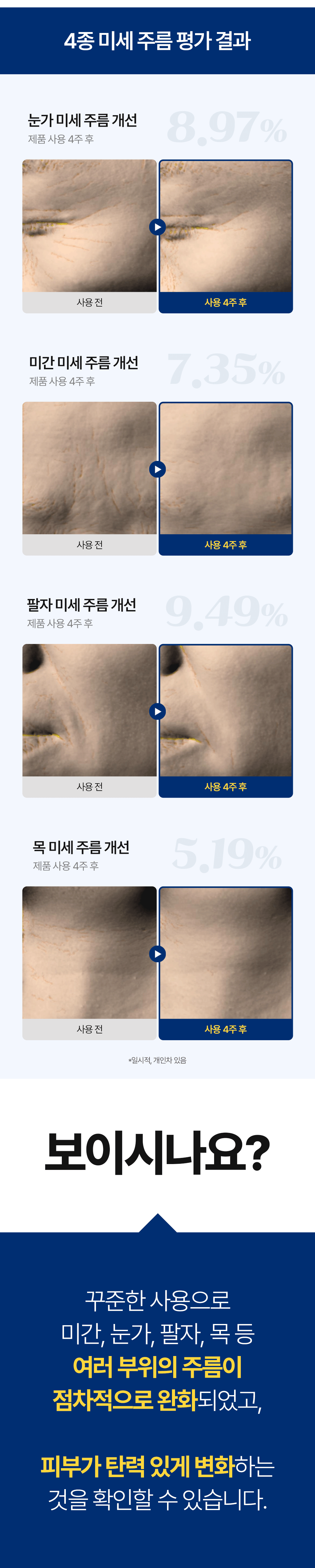- 매일 아침과 저녁에 꾸준히 사용하시길 권장 드리며, 집중 케어가 필요한 부위에 덧발라 주시길 권장 드립니다.
