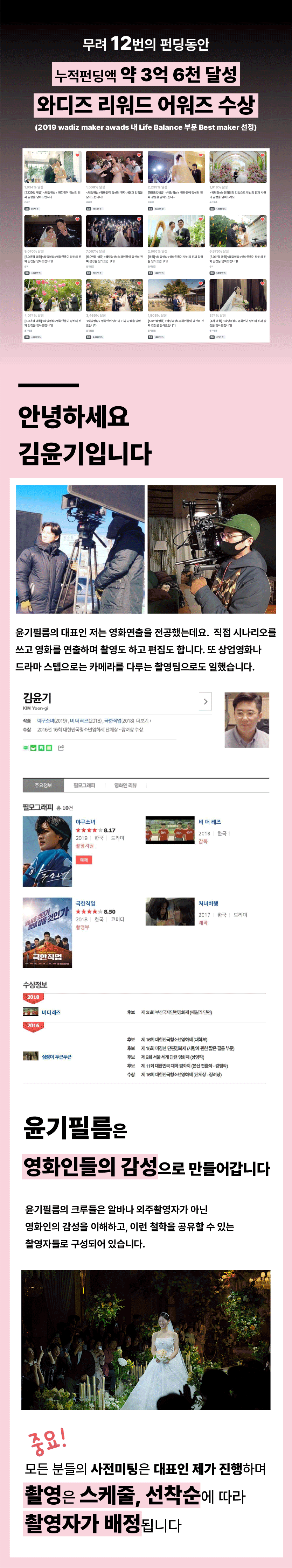 在来到这里的过程中,Wadiz这个平台成为了润基电影坚强的后盾。在众筹还很陌生的时期,偶然通过Wadiz想要试验一下电影人的婚礼视频是否会受到大家的喜爱,结果一路走到了现在。我认为选择了韩国最具影响力的众筹平台Wadiz,对我现在的生活也产生了很大影响。