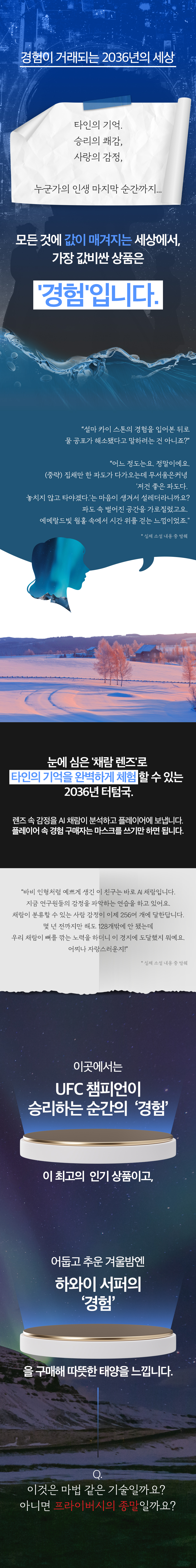 그것이 점차 발전하여 '눈에 카메라를 심어 타인의 경험을 옷 입듯 입어보는' 디스토피아 사회로 변모했습니다.
