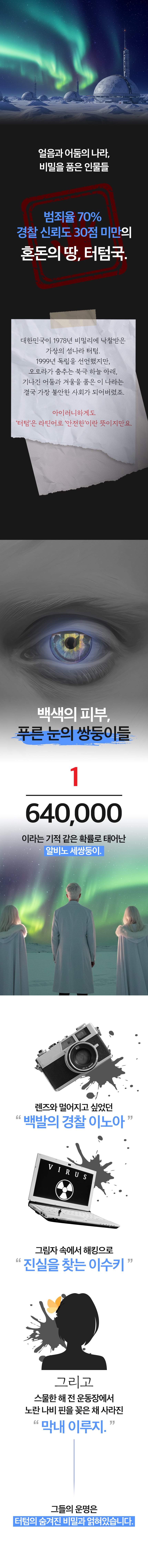 정의롭지만 불완전한 알비노 형사 이노아, 비밀을 간직한 그의 쌍둥이 자매 수키, 21년 전 사라진 동생 루지...