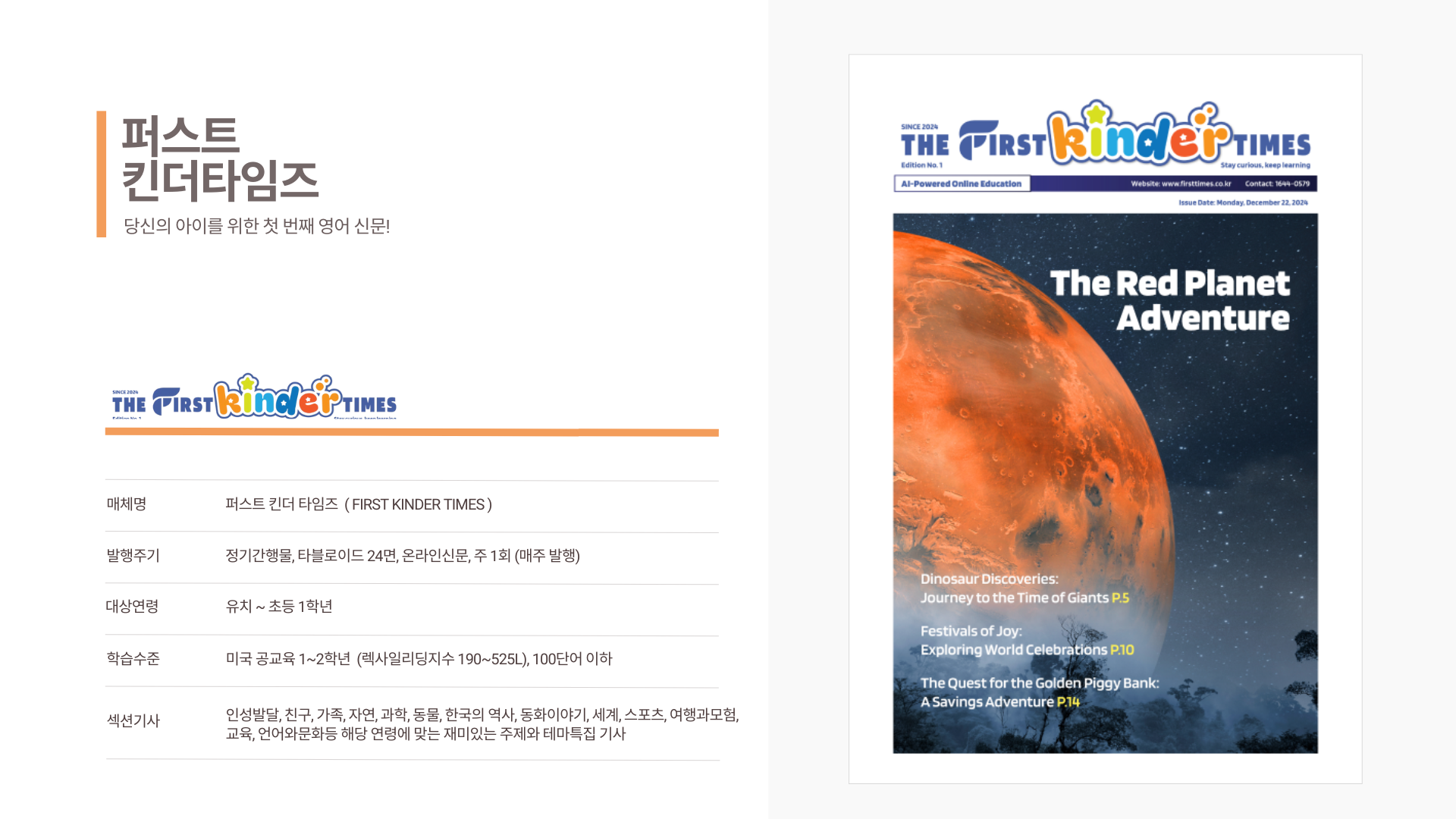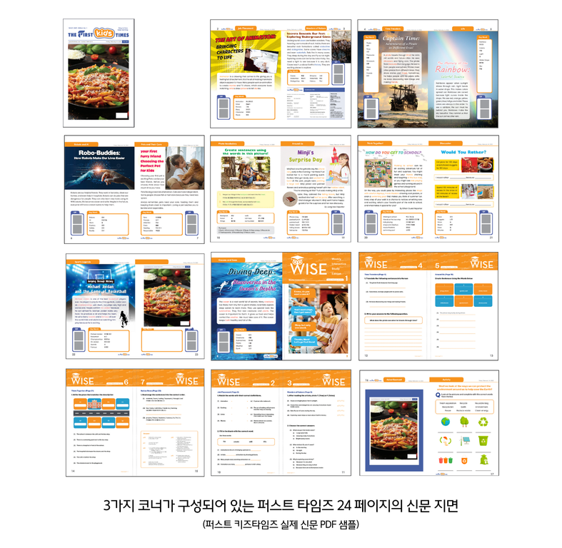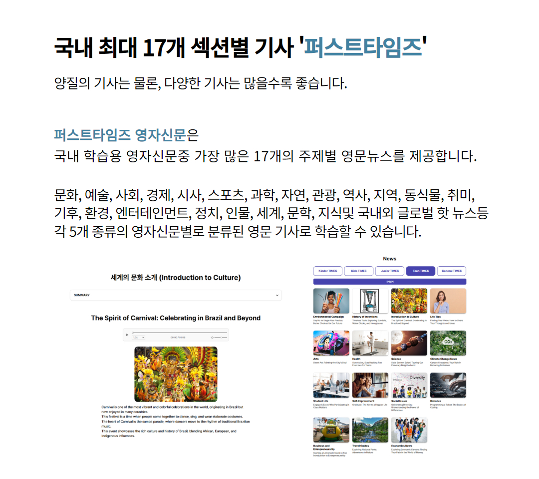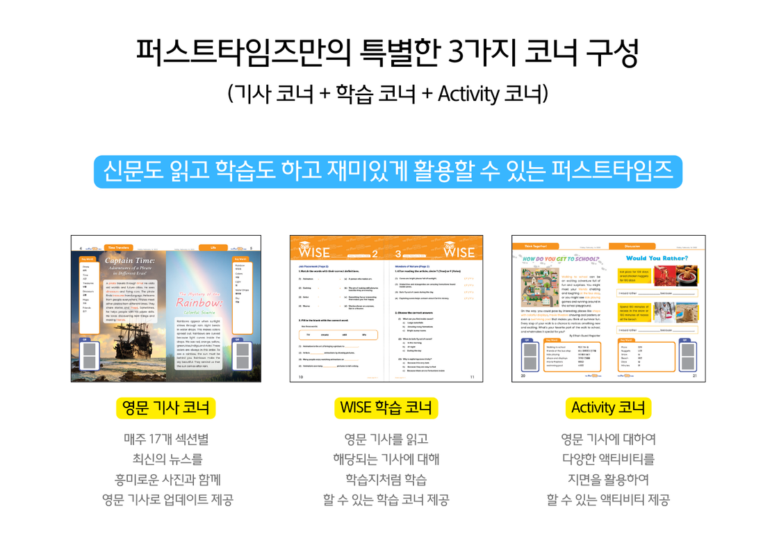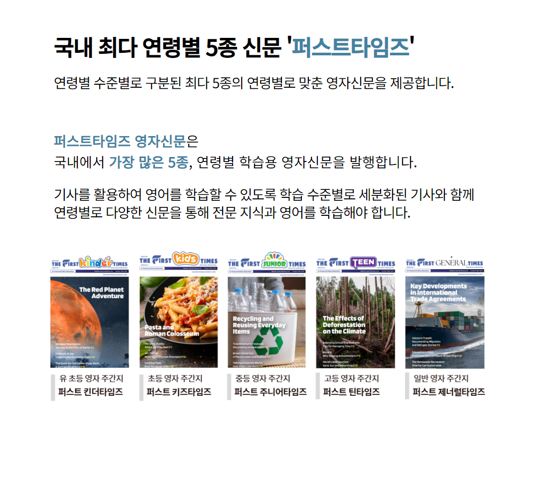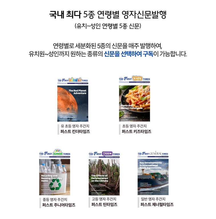 유치원생이 보는 퍼스트 킨더, 초등생용 퍼스트 키즈, 중등생용 퍼스트 주니어, 고등생용 퍼스트 틴, 대학 및 성인들이 보는 퍼스트 제너럴 타임즈까지 5가지 신문이 연령별로 각각 다른 기사로 매주 발행되요.