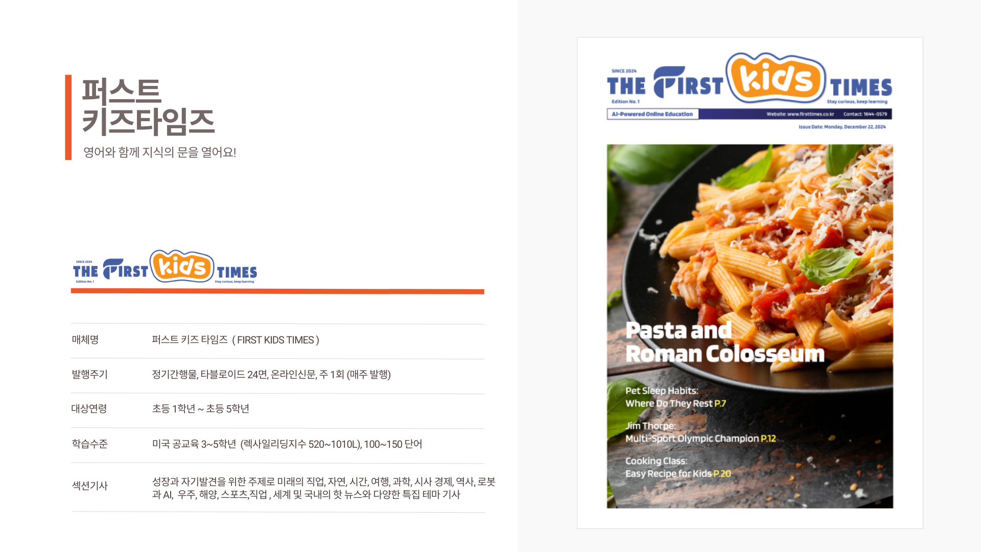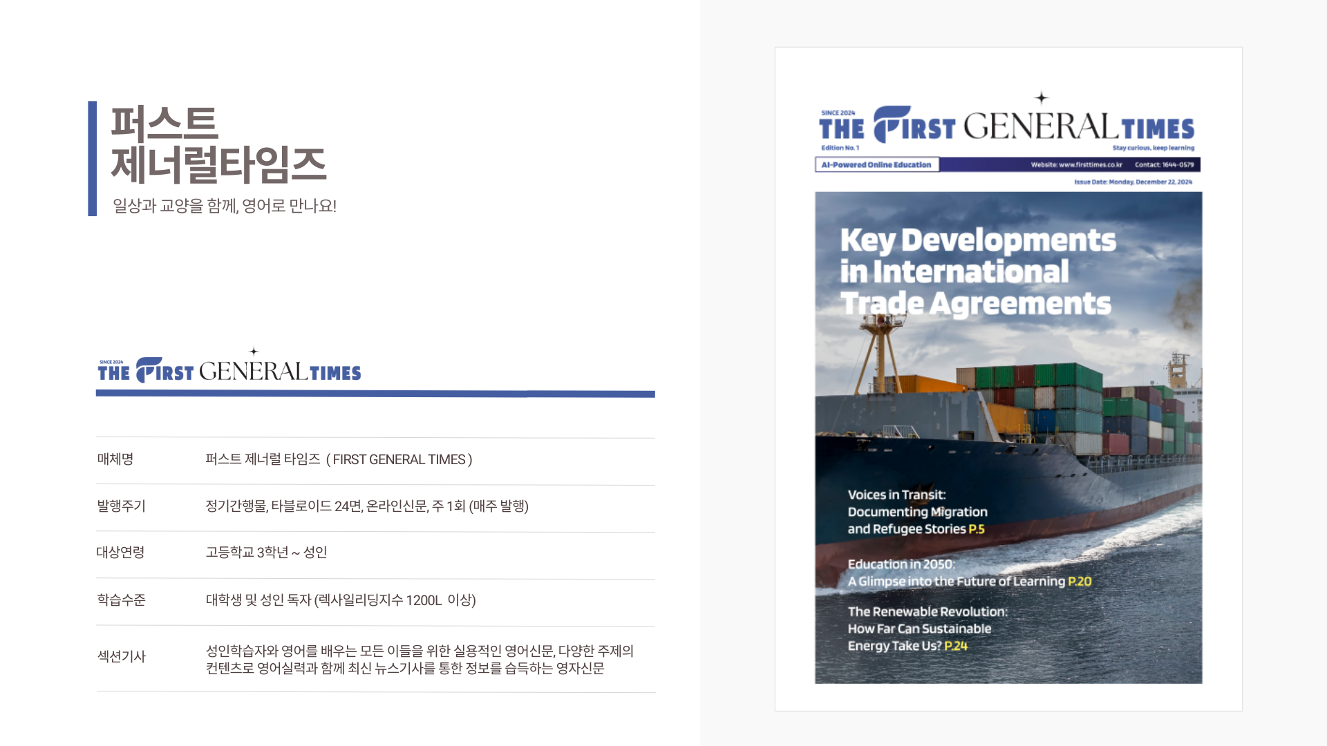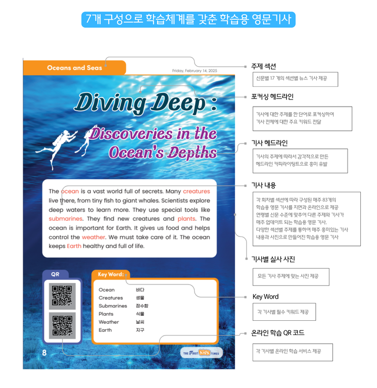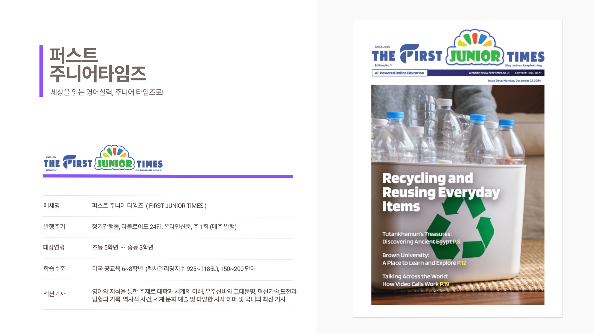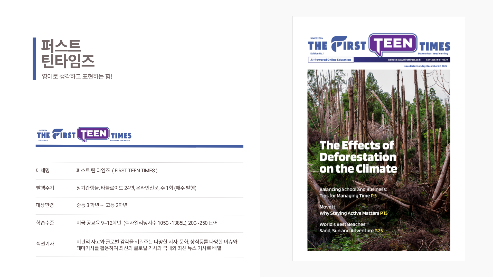 유치원생이 보는 퍼스트 킨더, 초등생용 퍼스트 키즈, 중등생용 퍼스트 주니어, 고등생용 퍼스트 틴, 대학 및 성인들이 보는 퍼스트 제너럴 타임즈까지 5가지 신문이 연령별로 각각 다른 기사로 매주 발행되요.
