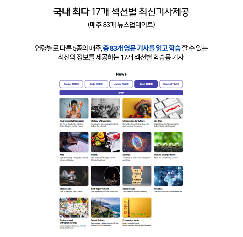 실시간 뉴스기사와 주제별 테마기사로 시사, 상식은 물론 다양한 지식을 키우면서 영어 실력도 늘려보세요.