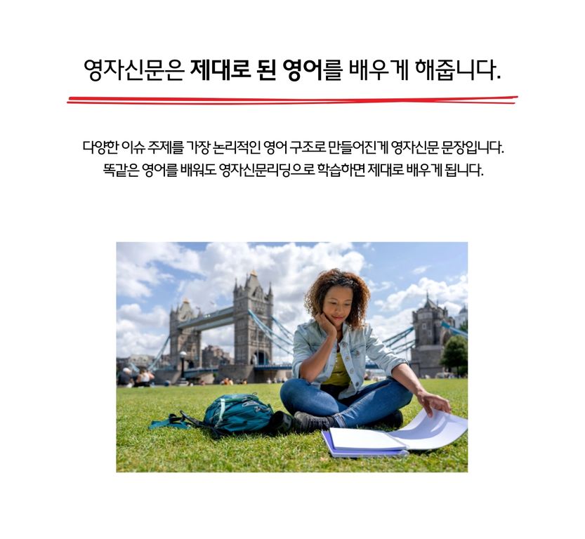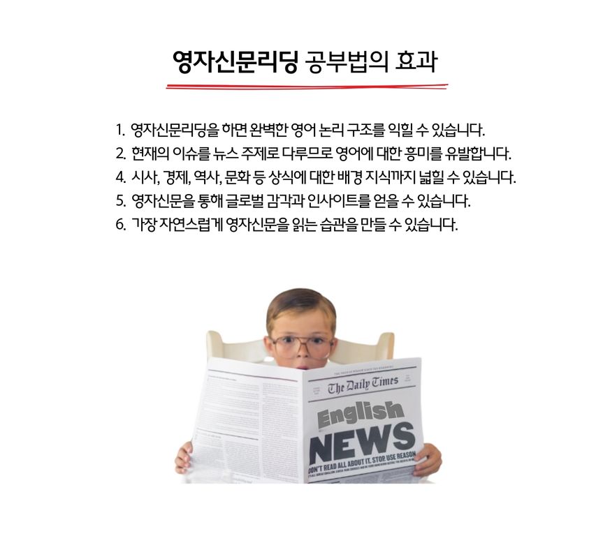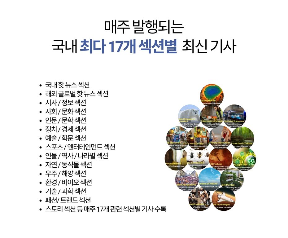 매주 업데이트 되는 영자신문 기사를 읽으면서 영어를 공부하면 그 효과가 매우 좋아요. 매주 지루하지 않게 다양한 영문 기사를 읽고 배우면서 시사 상식 지식을 쌓아가면서 실용적인 영어를 배우는 장점이 있어서 그 효과는 너무 좋다고 하죠.
