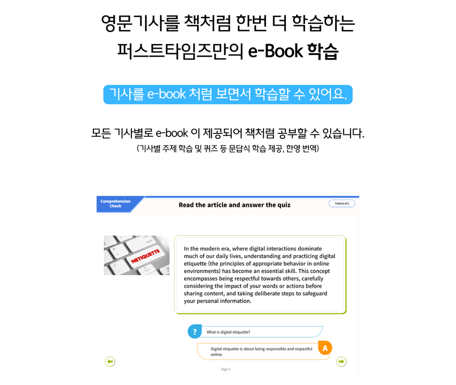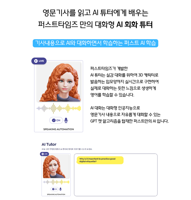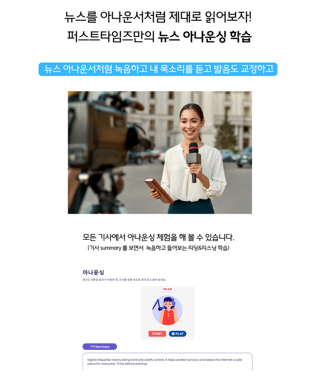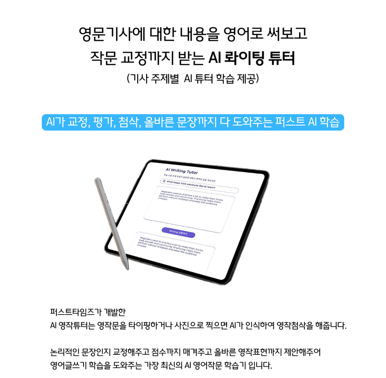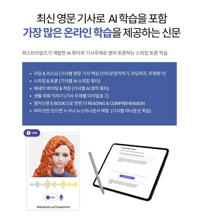 영문 뉴스 기사를 읽고, 듣고, 단어 문장을 익히고, 기사 내용으로 대화를 하고 주제 문장을 쓰고 퍼스트타임즈에서 개발한 온라인 학습용 Ai에게 교정을 받고 Ai와 대화해보면서 스피킹까지 완전한 학습을 신문을 읽으면서 매일 할 수 있습니다.