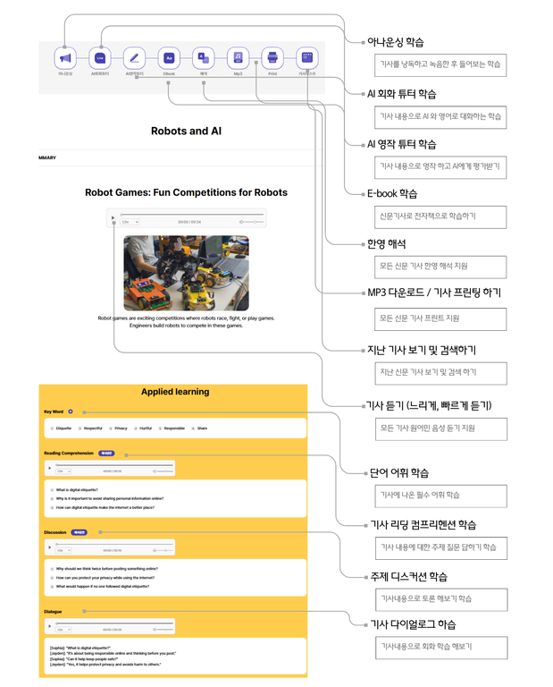 영자신문을 혼자서 읽고 영어를 배우게 하는 AI 학습 기능을 갖춘 온라인 학습