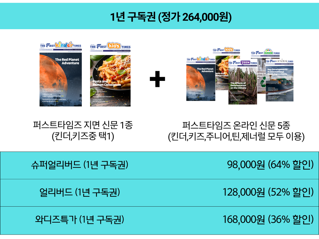 - 퍼스트타임즈 지면 신문 구독 1년권 (킨더, 키즈 중 택1) + 온라인 신문 5종 1년 이용권 증정