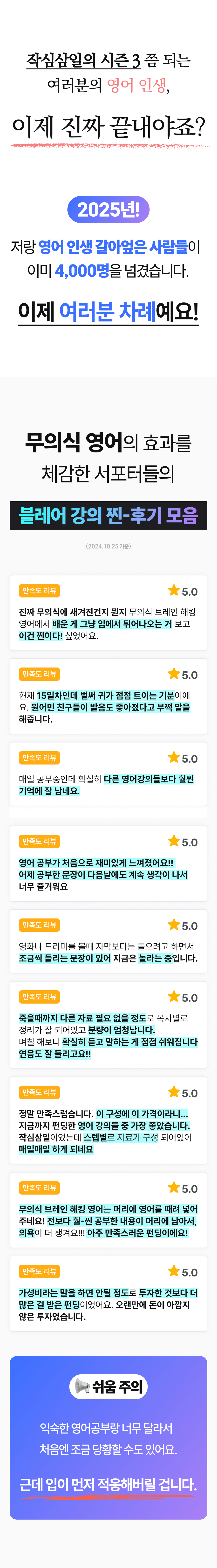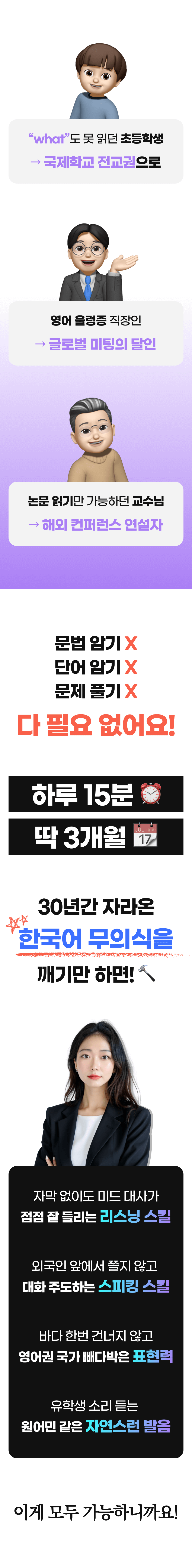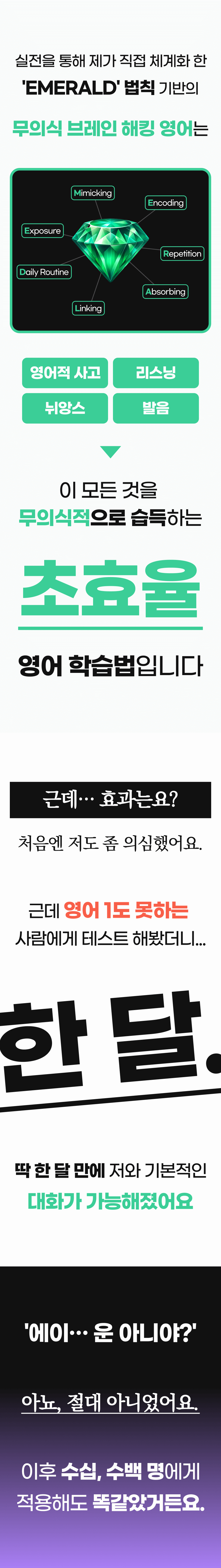 그 결과, 저만의 독특한 '무의식 영어 학습법'을 개발하게 되었습니다. 이 방법은 단기간에 영어 회화 실력을 획기적으로 향상시킬 수 있다는 것을 제 자신을 통해 증명했고, 이후 수강생들에게도 적용해 놀라운 효과를 보았습니다.
