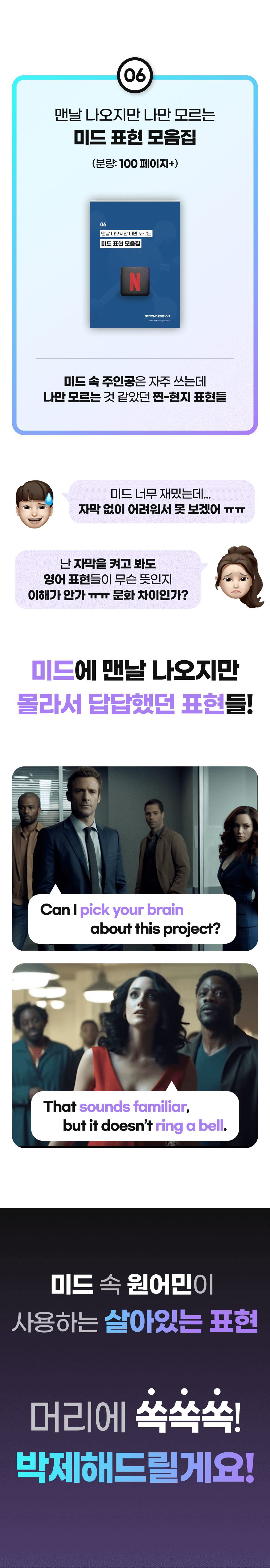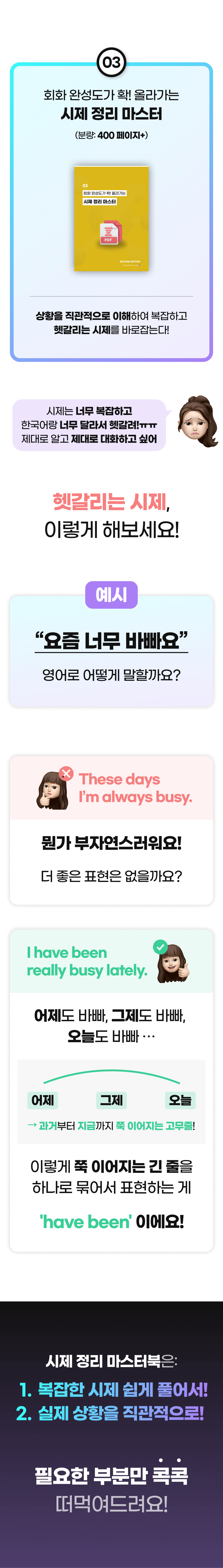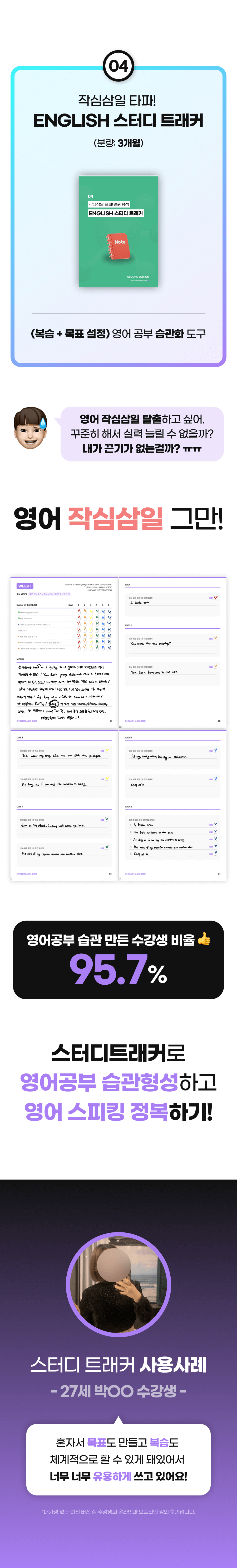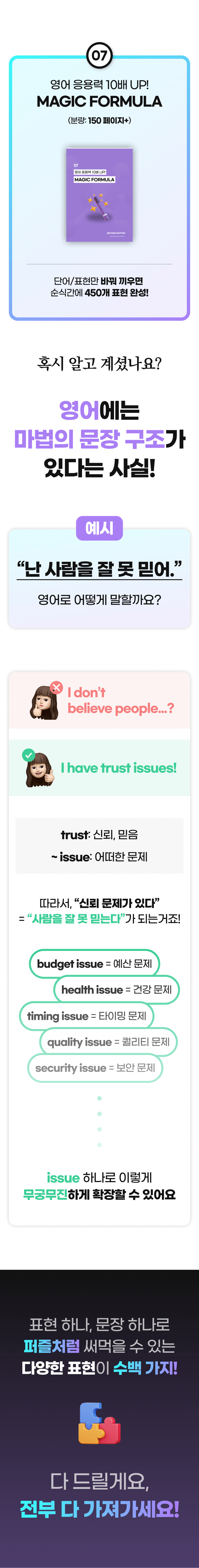 또한, 이 학습법을 체험하게 될 모든 학습자들이 더욱 풍부한 경험을 할 수 있게 하기 위해 추가적으로 다양한 학습 자료를 만들 예정이에요. 학습자들이 영어에 부담을 느끼지 않고 더욱 재미있고 효과적으로 배울 수 있도록 도와주는 것이 목표니까요!