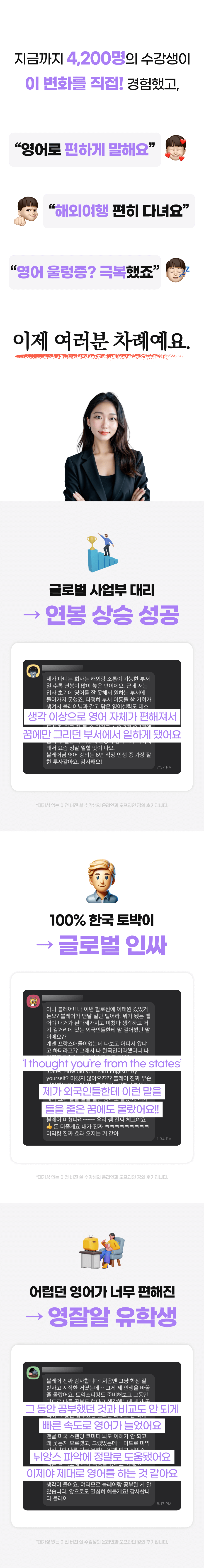 수강생들은 이전에는 상상도 못 했던 영어 회화 능력의 향상을 경험했고, 그들의 성공 사례와 감사의 메시지는 제가 이 방법을 더 많은 사람들에게 알려야 한다는 확신을 주었습니다.